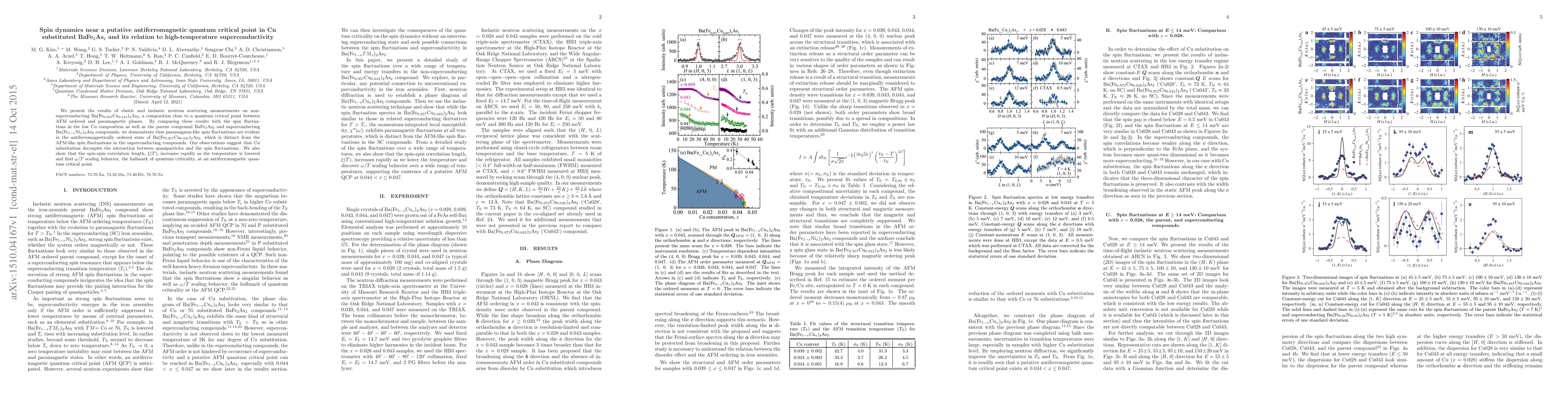 We present the results of elastic and inelastic neutron scattering measurements on non-superconducting Ba(Fe${_{0.957}}$Cu${_{0.043}}$)${_2}$As${_2}$, a composition close to a quantum critical point between AFM ordered and paramagnetic phases. By comparing these results with the spin fluctuations in the low Cu composition as well as the parent compound BaFe$_2$As$_2$ and superconducting Ba(Fe$_{1-x}$Ni$_x$)$_2$As$_2$ compounds, we demonstrate that paramagnon-like spin fluctuations are evident in the antiferromagnetically ordered state of Ba(Fe$_{0.957}$Cu$_{0.043}$)$_2$As$_2$, which is distinct from the AFM-like spin fluctuations in the superconducting compounds. Our observations suggest that Cu substitution decouples the interaction between quasiparticles and the spin fluctuations. We also show that the spin-spin correlation length, ${\xi(T)}$, increases rapidly as the temperature is lowered and find ${\omega/T}$ scaling behavior, the hallmark of quantum criticality, at an antiferromagnetic quantum critical point.