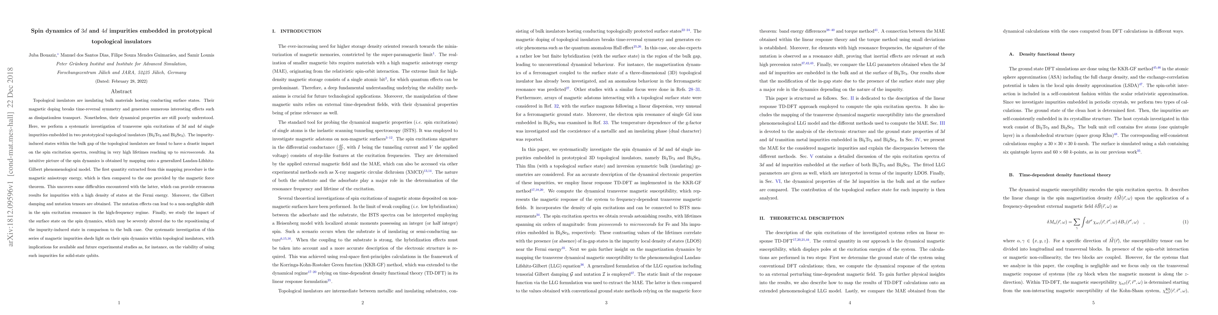 This paper investigates the spin dynamics of $3d$ and $4d$ impurities in topological insulators Bi$_2$Te$_3$ and Bi$_2$Se$_3$, revealing significant impacts on spin excitation spectra, high lifetimes, and shifts in spin resonance due to nutation effects. The study also highlights discrepancies in magnetic anisotropy energy calculations and the potential for these impurities in solid-state qubits.