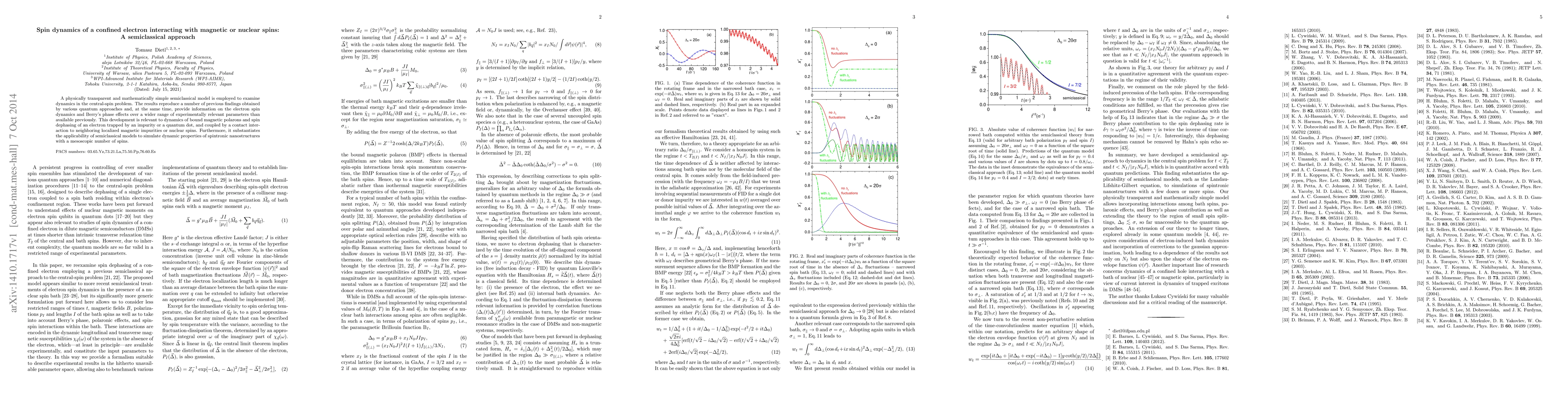 This paper uses a semiclassical model to study the spin dynamics of a confined electron interacting with magnetic or nuclear spins, reproducing previous quantum results and providing insights into electron spin dynamics and Berry's phase effects over a broader range of parameters. The findings are relevant for understanding the dynamics of bound magnetic polarons and spin dephasing in quantum dots and support the use of semiclassical models for simulating spintronic nanostructures.
