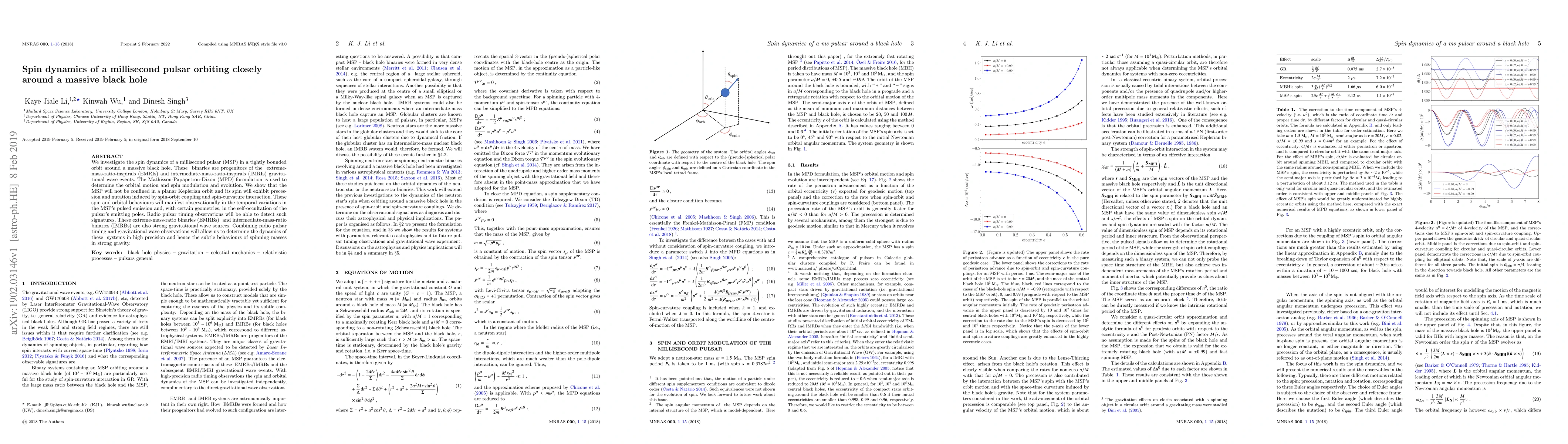 We investigate the spin dynamics of a millisecond pulsar (MSP) in a tightly bounded orbit around a massive black hole. These binaries are progenitors of the extreme-mass-ratio-inspirals (EMRIs) and intermediate-mass-ratio-inspirals (IMRIs) gravitational wave events. The Mathisson-Papapetrou-Dixon (MPD) formulation is used to determine the orbital motion and spin modulation and evolution. We show that the MSP will not be confined in a planar Keplerian orbit and its spin will exhibit precession and nutation induced by spin-orbit coupling and spin-curvature interaction. These spin and orbital behaviours will manifest observationally in the temporal variations in the MSP's pulsed emission and, with certain geometries, in the self-occultation of the pulsar's emitting poles. Radio pulsar timing observations will be able to detect such signatures. These extreme-mass-ratio binaries (EMRBs) and intermediate-mass-ratio binaries (IMRBs) are also strong gravitational wave sources. Combining radio pulsar timing and gravitational wave observations will allow us to determine the dynamics of these systems in high precision and hence the subtle behaviours of spinning masses in strong gravity.