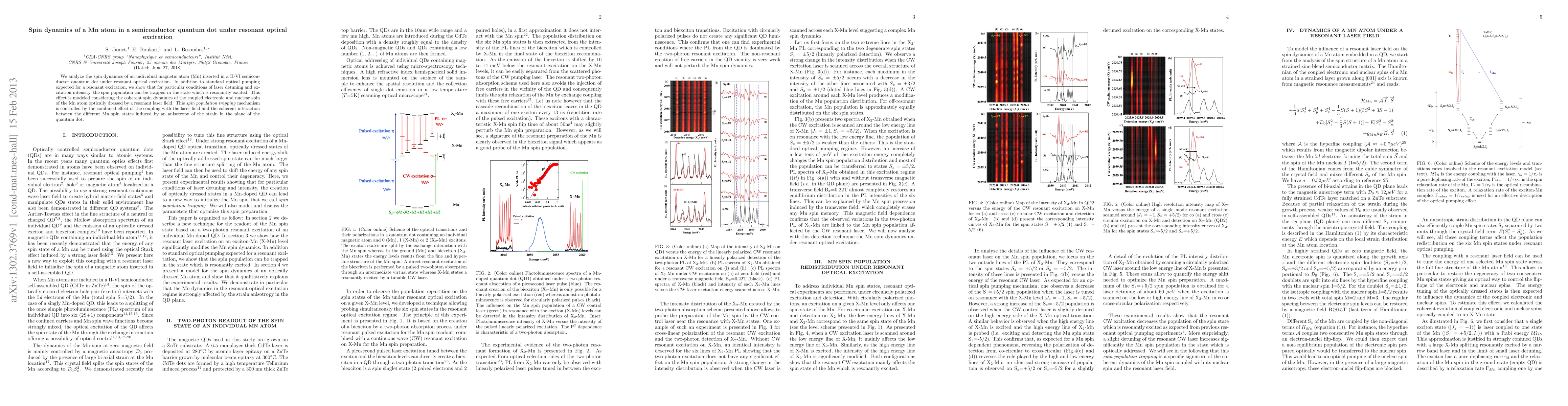 This paper investigates the spin dynamics of a Mn atom in a semiconductor quantum dot under resonant optical excitation, revealing a unique spin population trapping mechanism influenced by laser detuning and intensity, alongside the interplay of electronic and nuclear spin dynamics and strain anisotropy effects.