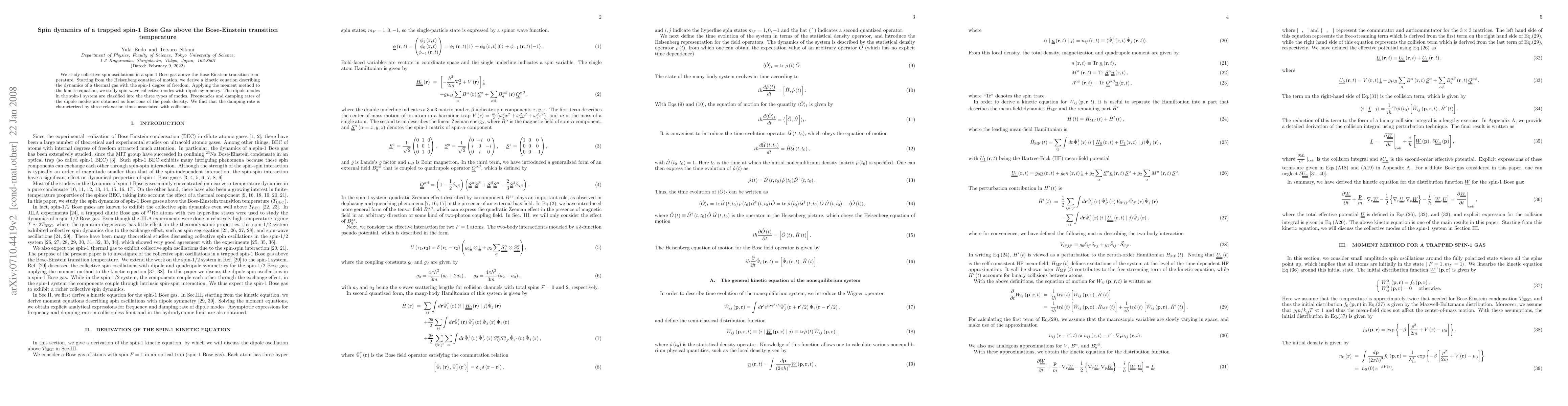 This paper investigates collective spin oscillations in a spin-1 Bose gas above the Bose-Einstein transition temperature, deriving a kinetic equation to describe its dynamics. It identifies three types of dipole spin-wave modes, with frequency and damping rate determined by peak density and collision-induced relaxation times.