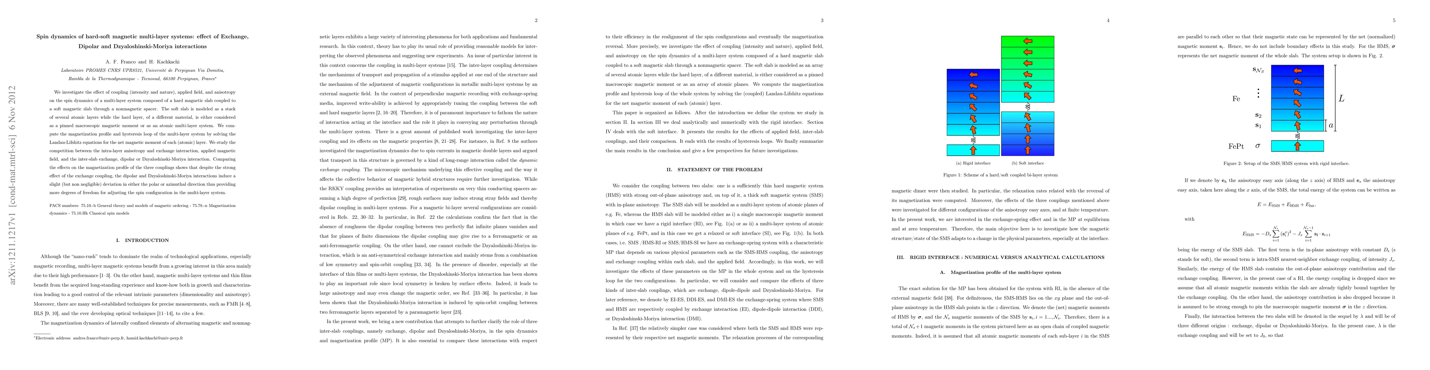 This paper explores the spin dynamics in hard-soft magnetic multi-layer systems, focusing on the effects of exchange, dipolar, and Dzyaloshinski-Moriya interactions. It finds that while exchange coupling dominates, dipolar and Dzyaloshinski-Moriya interactions introduce subtle deviations, enhancing the system's spin configuration flexibility.