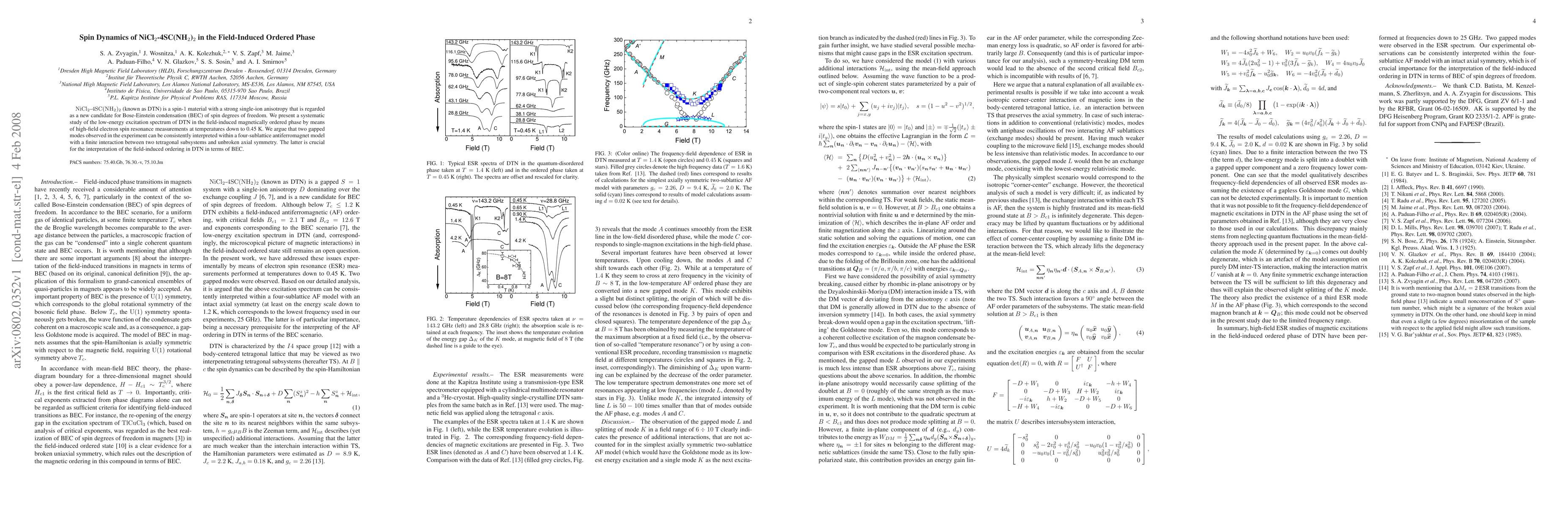 This study investigates the spin dynamics of $Ni Cl_2-4SC(NH_2)_2$ (DTN) using high-field electron spin resonance, revealing two gapped modes in its low-energy spectrum. The findings support a four-sublattice antiferromagnet model, crucial for understanding its field-induced magnetic ordering and potential Bose-Einstein condensation.