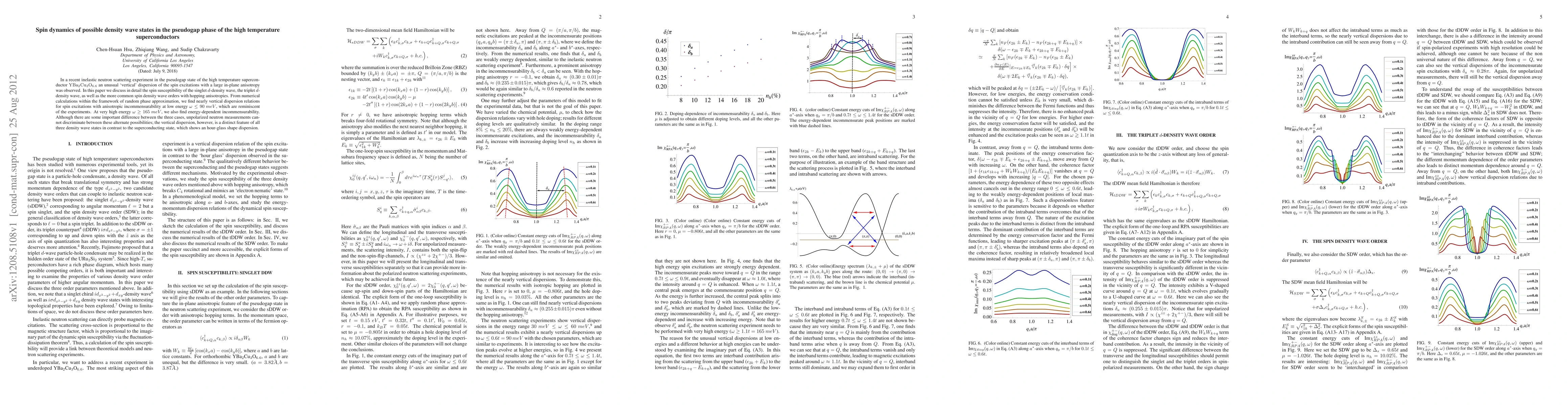 In a recent inelastic neutron scattering experiment in the pseudogap state of the high temperature superconductor $\mathrm{YBa_{2}Cu_{3}O_{6.6}}$ an unusual `vertical' dispersion of the spin excitations with a large in-plane anisotropy was observed. In this paper we discuss in detail the spin susceptibility of the singlet $d$-density wave, the triplet $d$-density wave, as well as the more common spin density wave orders with hopping anisotropies. From numerical calculations within the framework of random phase approximation, we find nearly vertical dispersion relations for spin excitations with anisotropic incommensurability at low energy $\omega \le 90 meV$, which are reminiscent of the experiments. At very high energy $\omega \ge 165 meV$, we also find energy-dependent incommensurability. Although there are some important difference between the three cases, unpolarized neutron measurements cannot discriminate between these alternate possibilities; the vertical dispersion, however, is a distinct feature of all three density wave states in contrast to the superconducting state, which shows an hour-glass shape dispersion.