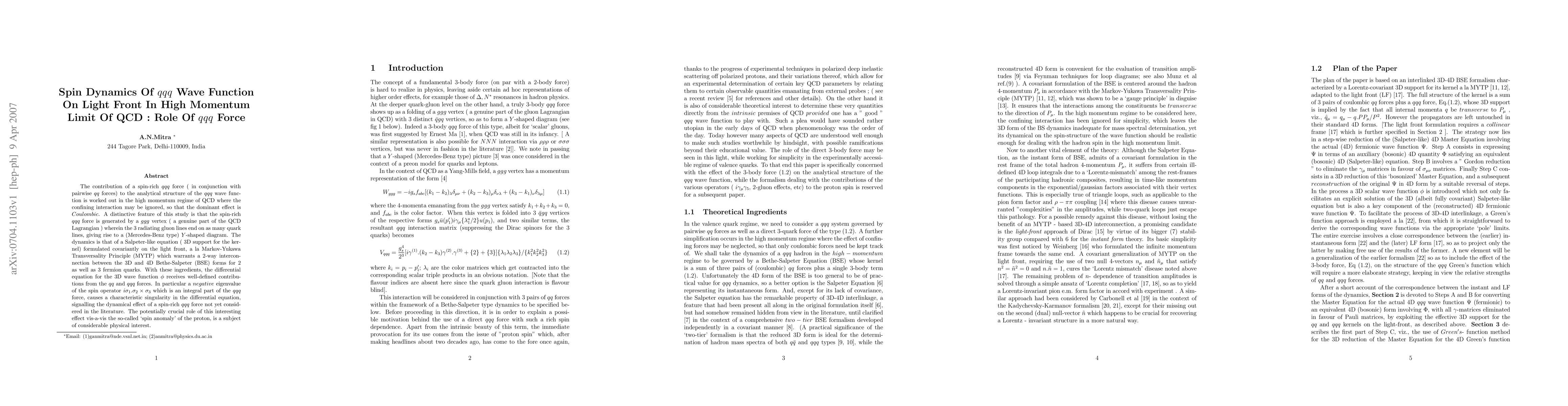 The contribution of a spin-rich $qqq$ force (in conjunction with pairwise $qq$ forces) to the analytical structure of the $qqq$ wave function is worked out in the high momentum regime of QCD where the confining interaction may be ignored, so that the dominant effect is $Coulombic$. A distinctive feature of this study is that the spin-rich $qqq$ force is generated by a $ggg$ vertex (a genuine part of the QCD Lagrangian) wherein the 3 radiating gluon lines end on as many quark lines, giving rise to a (Mercedes-Benz type) $Y$-shaped diagram. The dynamics is that of a Salpeter-like equation (3D support for the kernel) formulated covariantly on the light front, a la Markov-Yukawa Transversality Principle (MYTP) which warrants a 2-way interconnection between the 3D and 4D Bethe-Salpeter (BSE) forms for 2 as well as 3 fermion quarks. With these ingredients, the differential equation for the 3D wave function $\phi$ receives well-defined contributions from the $qq$ and $qqq$ forces. In particular a $negative$ eigenvalue of the spin operator $i \sigma_1.\sigma_2\times \sigma_3$ which is an integral part of the $qqq$ force, causes a characteristic singularity in the differential equation, signalling the dynamical effect of a spin-rich $qqq$ force not yet considered in the literature. The potentially crucial role of this interesting effect vis-a-vis the so-called `spin anomaly' of the proton, is a subject of considerable physical interest.