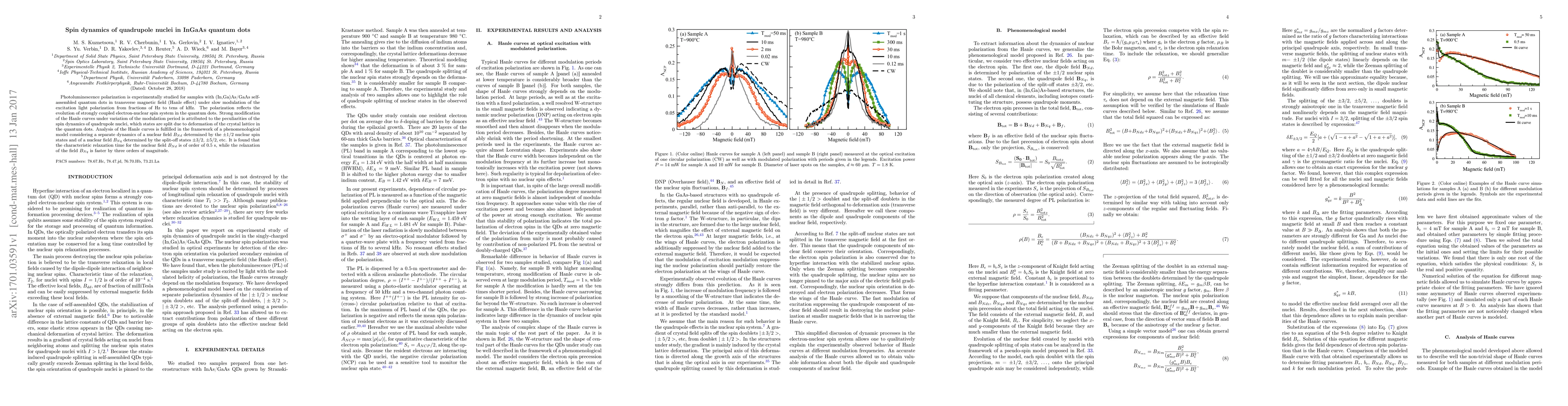 This study investigates the spin dynamics of quadrupole nuclei in InGaAs quantum dots using photoluminescence polarization and Hanle effect measurements. The research reveals distinct relaxation times for different nuclear spin states, with BNd relaxing over 0.5 seconds and BNq relaxing much faster by three orders of magnitude.