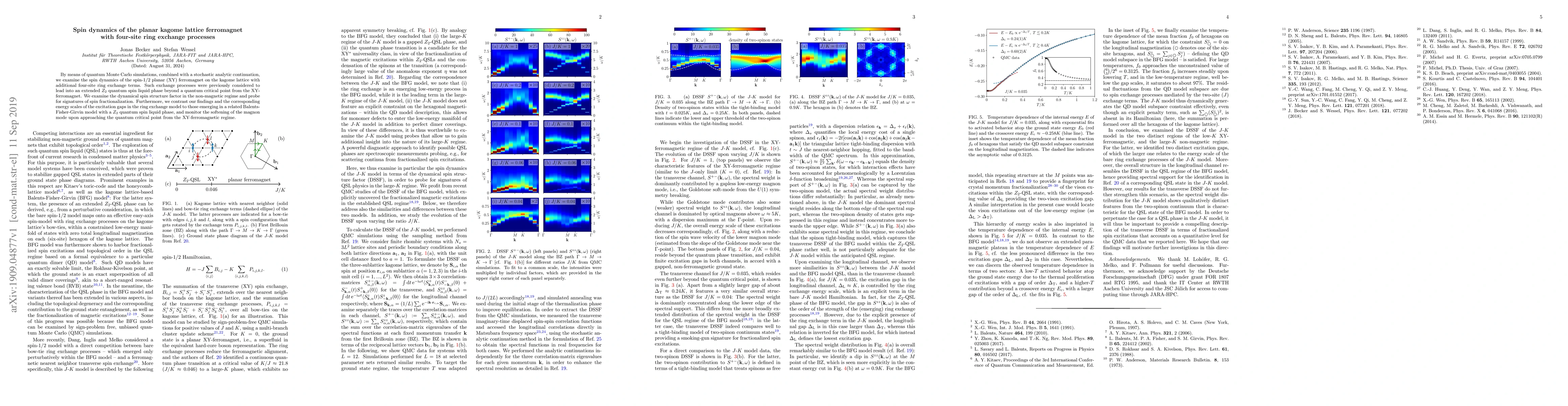 This paper uses quantum Monte Carlo simulations to study the spin dynamics of a spin-1/2 ferromagnet on the kagome lattice with four-site ring exchange processes, revealing signatures of spin fractionalization and comparing the results to a related model with a $Z_2$ quantum spin liquid phase. The study observes the softening of the magnon mode near the quantum critical point.
