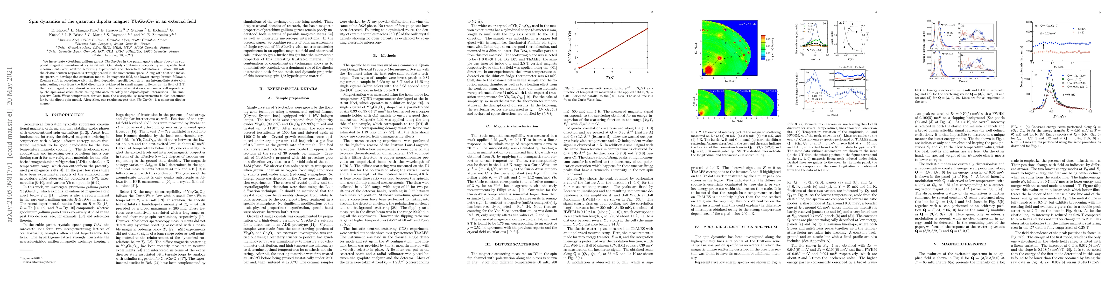 This study investigates the spin dynamics of the quantum dipolar magnet Yb$_3$Ga$_5$O$_{12}$ in an external magnetic field, revealing spin canting and saturation at 2 T, and confirming the material's behavior through neutron scattering and theoretical calculations focused on dipole-dipole interactions.