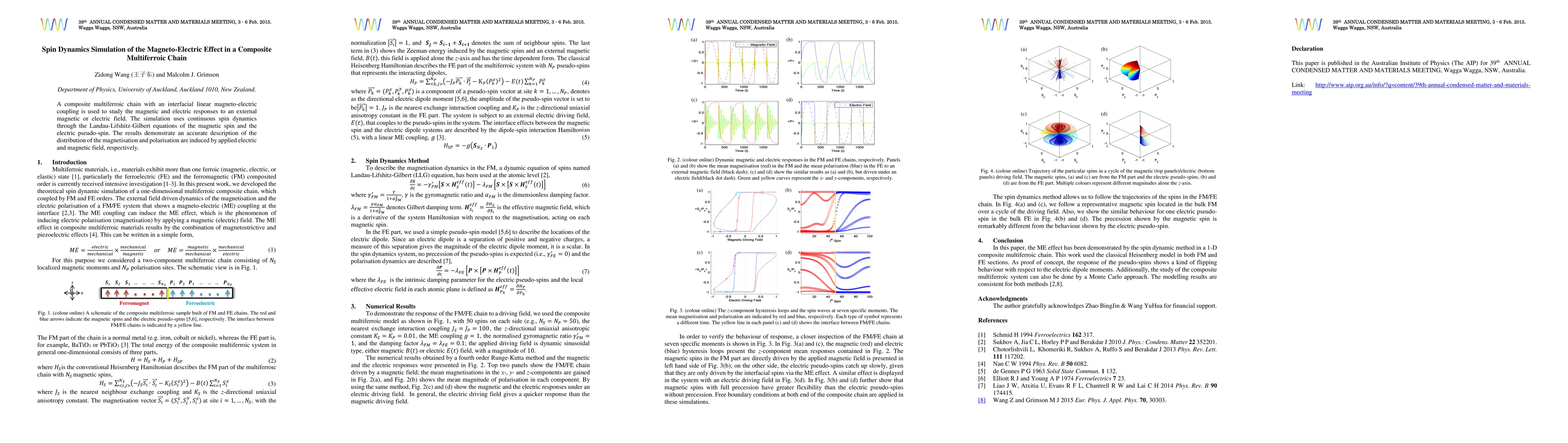 This paper simulates the spin dynamics in a composite multiferroic chain with linear magneto-electric coupling, using Landau-Lifshitz-Gilbert equations. The study accurately describes the induced magnetisation and polarisation under external magnetic and electric fields.