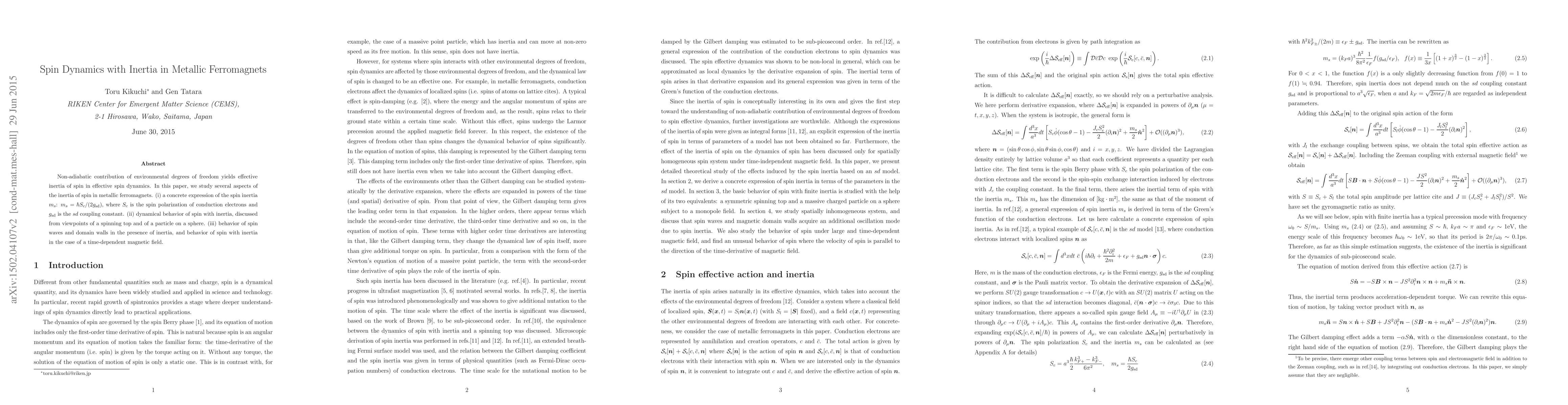 This paper investigates the effective inertia of spin in metallic ferromagnets, deriving a concrete expression for spin inertia $m_s$ and exploring its dynamical behavior through analogies with a spinning top and a particle on a sphere. It also examines the impact of spin inertia on spin waves, domain walls, and spin dynamics under time-varying magnetic fields.