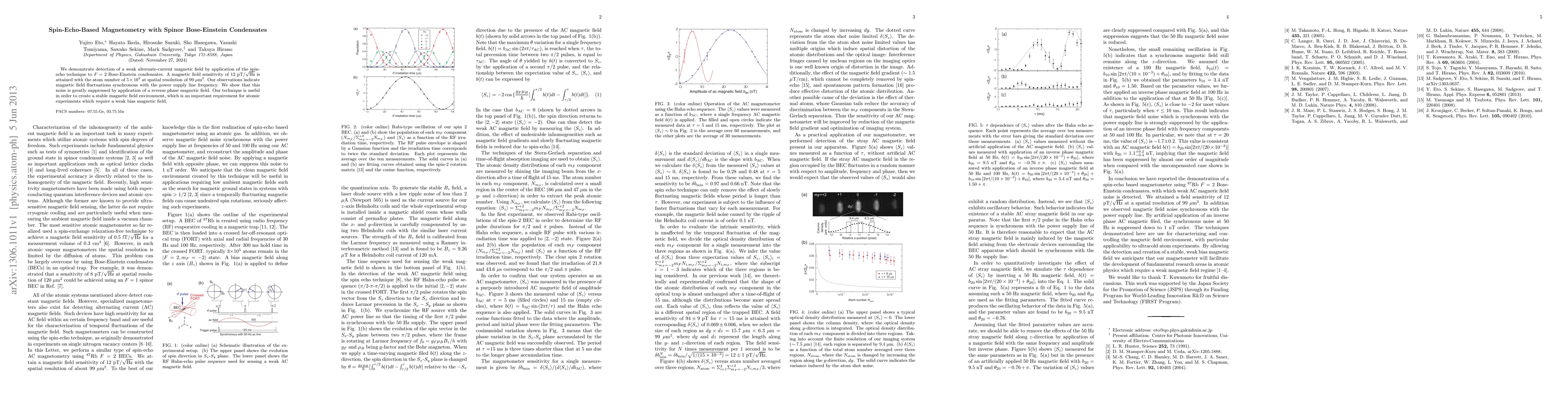 We demonstrate detection of a weak alternate-current magnetic field by application of the spin echo technique to F = 2 Bose-Einstein condensates. A magnetic field sensitivity of 12 pT/Hz^1/2 is attained with the atom number of 5*10^3 at spatial resolution of 99 \mu m^2. Our observations indicate magnetic field fluctuations synchronous with the power supply line frequency. We show that this noise is greatly suppressed by application of a reverse phase magnetic field. Our technique is useful in order to create a stable magnetic field environment, which is an important requirement for atomic experiments which require a weak bias magnetic field.