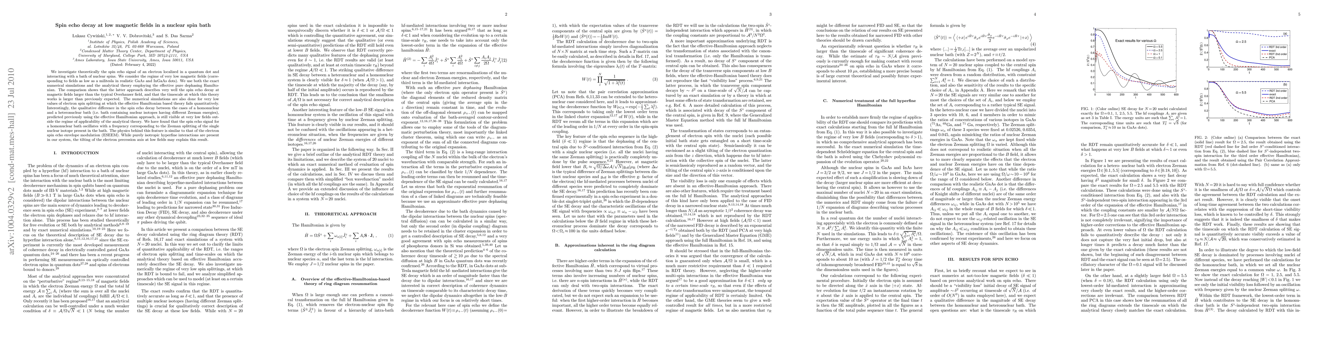 This paper theoretically investigates the spin echo signal of an electron in a quantum dot interacting with a nuclear spin bath at very low magnetic fields. The study finds that analytical theory effectively describes spin echo decay at larger magnetic fields, while numerical simulations reveal qualitative differences in spin echo decay between homonuclear and heteronuclear nuclear baths, even at low fields where the analytical approach is not quantitatively applicable.