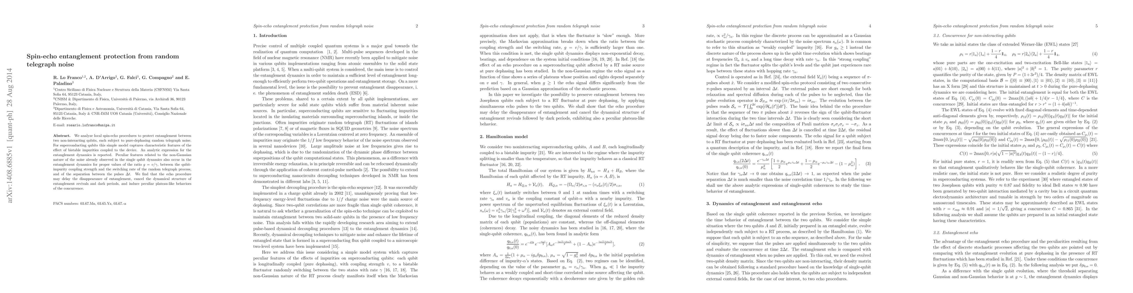 This paper investigates how spin-echo techniques can protect entanglement between two non-interacting qubits affected by pure-dephasing random telegraph noise, particularly in superconducting qubits. It finds that the echo procedure can delay entanglement loss, cancel revivals and dark periods, and induce plateau-like concurrence behaviors depending on the coupling strength and pulse separation.