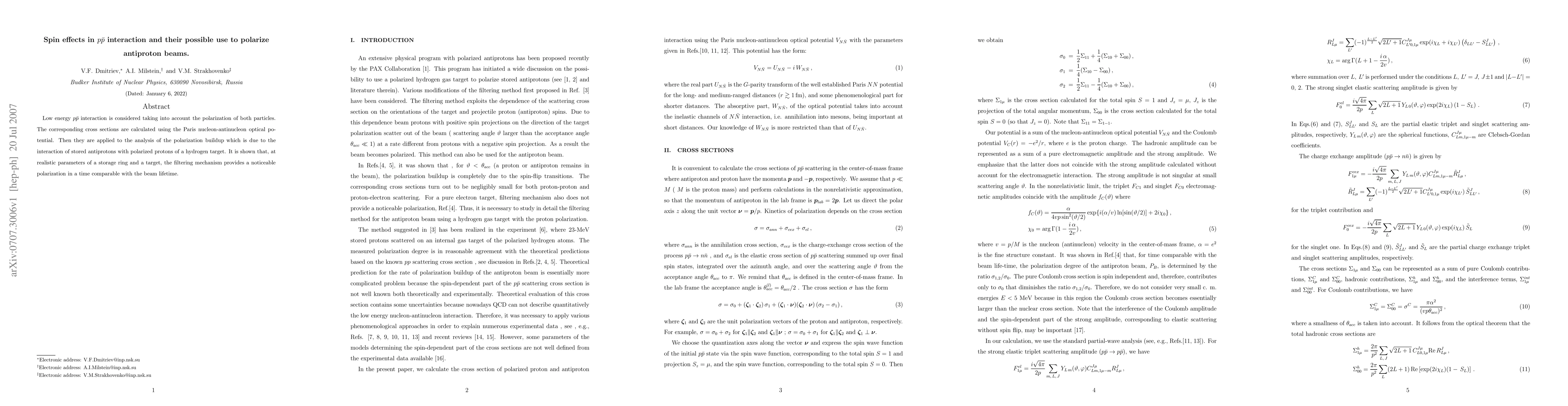 Low energy $p\bar p$ interaction is considered taking into account the polarization of both particles. The corresponding cross sections are calculated using the Paris nucleon-antinucleon optical potential. Then they are applied to the analysis of the polarization buildup which is due to the interaction of stored antiprotons with polarized protons of a hydrogen target. It is shown that, at realistic parameters of a storage ring and a target, the filtering mechanism provides a noticeable polarization in a time comparable with the beam lifetime.