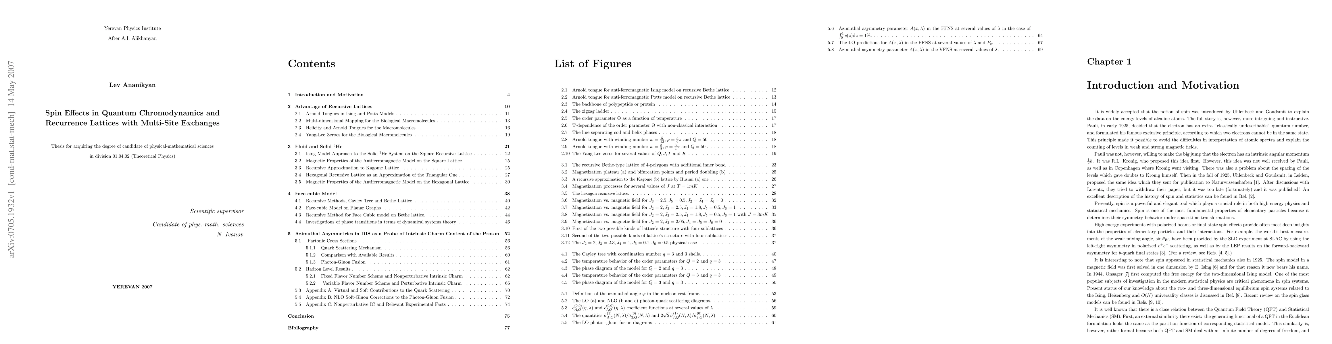 In this thesis, we consider some spin effects in QCD and recurrence lattices with multi-site exchanges. Main topic of our manuscript are critical phenomena in spin systems defined on the recurrence lattices. Main tool of our approach is the method of recursive (hierarchical) lattices. We apply the method of dynamical mapping (or recursive lattices) for investigation of magnetic properties of the fluid and solid $^3$He, phase transitions in crystals and macromolecules. First, we analyze the helix-coil phase transition for polypeptides and proteins, and describe an quasi unfolding transition (like the cold denaturation process) for the degree of helicity (the order parameter for macromolecules). Next we consider the recurrent models of $^3$He defined on the square, Husimi and hexagon lattices. Using the method of dynamical mapping, the magnetization curves with plateaus, bifurcation point and one period doubling are obtained. Then we investigate the model with cubic symmetry defined on the Bethe lattice and containing both linear and quadratic spin-spin interactions. The magnetization of the system is calculated, and a complex structure of the phase transitions between the disordered, partially ordered and completely ordered states is observed. In the framework of QCD, we consider the azimuthal asymmetries in heavy flavor production in the lepton-nucleon deep inelastic scattering (DIS). We calculate the azimuthal (or $\phi$-) dependence of the next-to-leading order heavy-quark-initiated contributions to DIS. It is shown that, contrary to the basic gluon-initiated component, the photon-quark scattering mechanism is practically $\cos2\phi$-independent. We investigate the possibility of measuring both nonperturbative (intrinsic) and perturbative (CTEQ, MRST) charm distributions using the $\cos2\phi$ asymmetry.