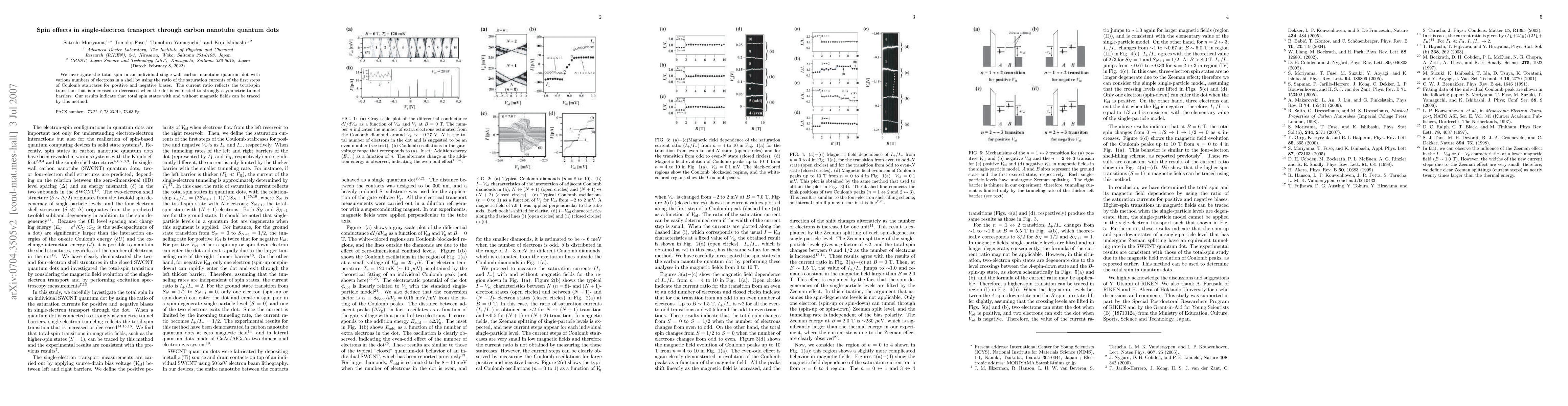 This study explores the spin effects in single-electron transport through carbon nanotube quantum dots by analyzing the saturation current ratios under different biases. The findings reveal that the total spin states can be traced through the current ratio, even in the absence of magnetic fields, when connected to asymmetric tunnel barriers.