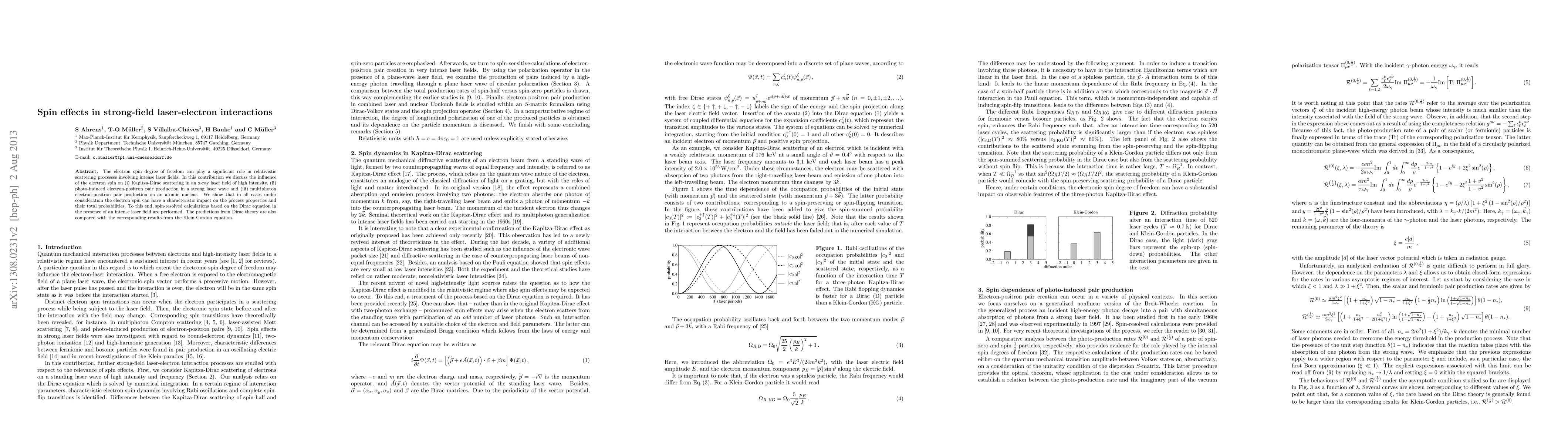 The electron spin degree of freedom can play a significant role in relativistic scattering processes involving intense laser fields. In this contribution we discuss the influence of the electron spin on (i) Kapitza-Dirac scattering in an x-ray laser field of high intensity, (ii) photo-induced electron-positron pair production in a strong laser wave and (iii) multiphoton electron-positron pair production on an atomic nucleus. We show that in all cases under consideration the electron spin can have a characteristic impact on the process properties and their total probabilities. To this end, spin-resolved calculations based on the Dirac equation in the presence of an intense laser field are performed. The predictions from Dirac theory are also compared with the corresponding results from the Klein-Gordon equation.