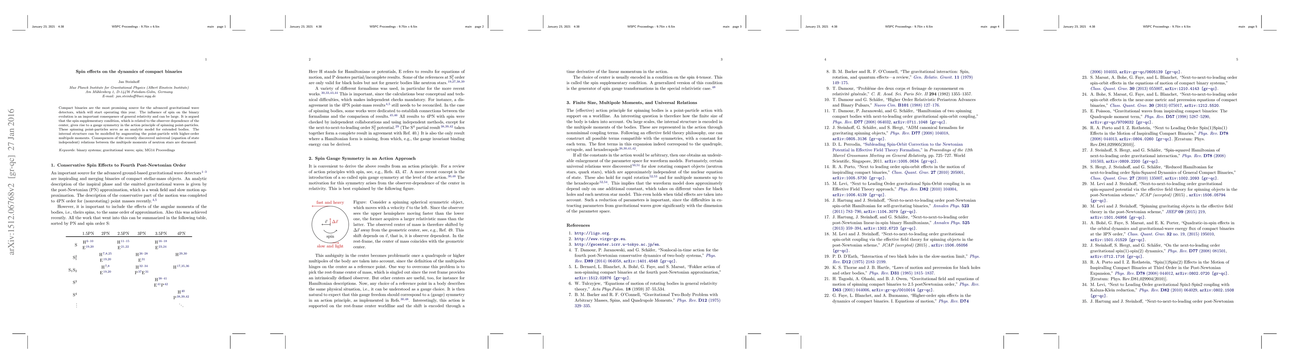 Compact binaries are the most promising source for the advanced gravitational wave detectors, which will start operating this year. The influence of spin on the binary evolution is an important consequence of general relativity and can be large. It is argued that the spin supplementary condition, which is related to the observer dependence of the center, gives rise to a gauge symmetry in the action principle of spinning point-particles. These spinning point-particles serve as an analytic model for extended bodies. The internal structure can be modelled by augmenting the point-particle with higher-order multipole moments. Consequences of the recently discovered universal (equation of state independent) relations between the multipole moments of neutron stars are discussed.