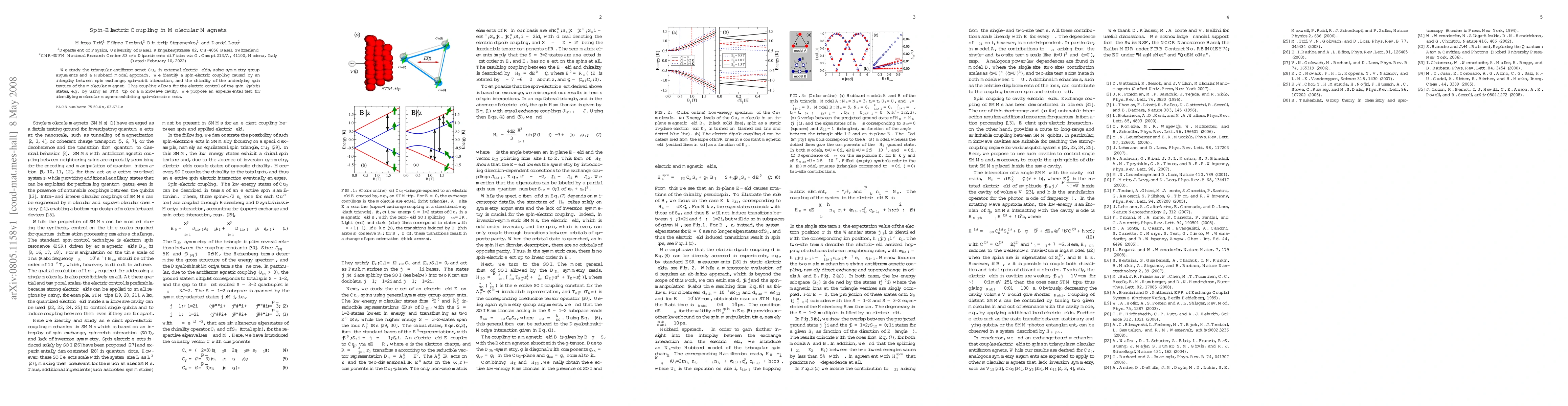 We study the triangular antiferromagnet Cu$_3$ in external electric fields, using symmetry group arguments and a Hubbard model approach. We identify a spin-electric coupling caused by an interplay between spin exchange, spin-orbit interaction, and the chirality of the underlying spin texture of the molecular magnet. This coupling allows for the electric control of the spin (qubit) states, e.g. by using an STM tip or a microwave cavity. We propose an experimental test for identifying molecular magnets exhibiting spin-electric effects.