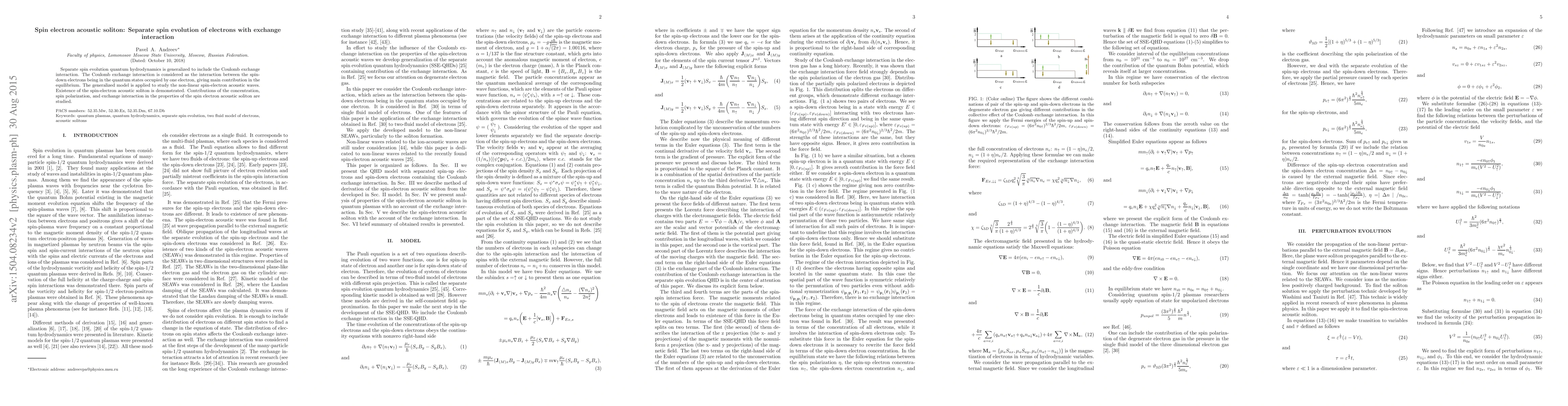 The generalization of separate spin evolution quantum hydrodynamics to include Coulomb exchange interaction, leading to the discovery and analysis of spin-electron acoustic solitons.
