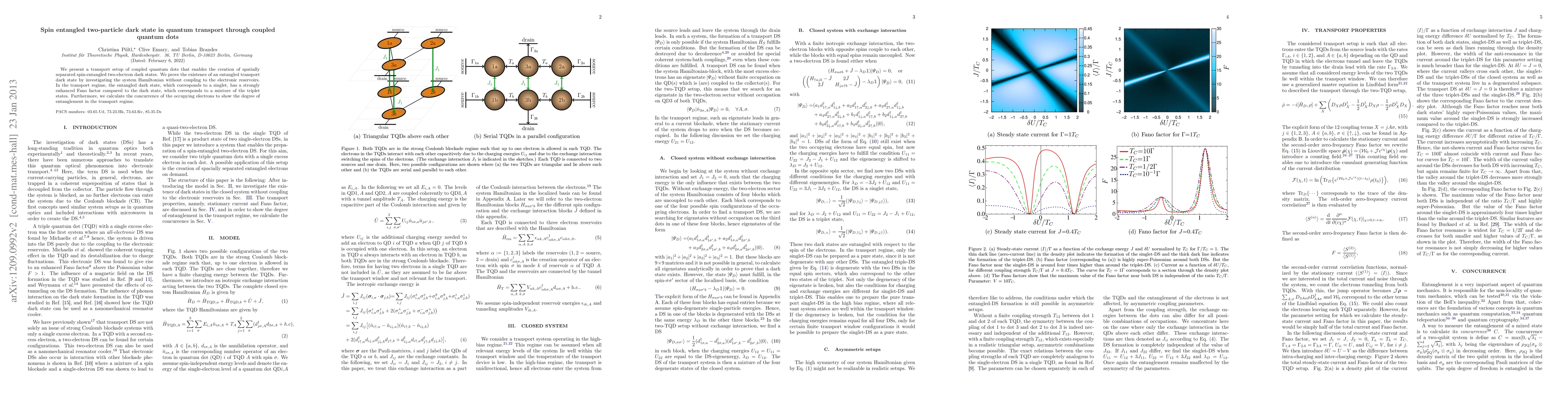 We present a transport setup of coupled quantum dots that enables the creation of spatially separated spin-entangled two-electron dark states. We prove the existence of an entangled transport dark state by investigating the system Hamiltonian without coupling to the electronic reservoirs. In the transport regime the entangled dark state which corresponds to a singlet has a strongly enhanced Fano factor compared to the dark state which corresponds to a mixture of the triplet states. Furthermore we calculate the concurrence of the occupying electrons to show the degree of entanglement in the transport regime.