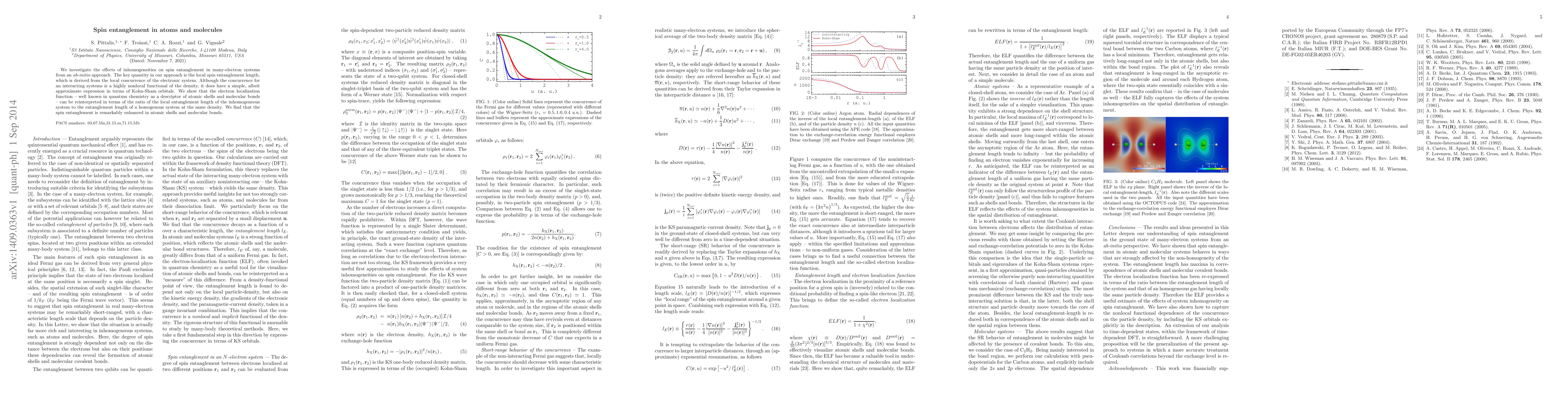 We investigate the effects of inhomogeneities on spin entanglement in many-electron systems from an ab-initio approach. The key quantity in our approach is the local spin entanglement length, which is derived from the local concurrence of the electronic system. Although the concurrence for an interacting systems is a highly nonlocal functional of the density, it does have a simple, albeit approximate expression in terms of Kohn-Sham orbitals. We show that the electron localization function -- well known in quantum chemistry as a descriptor of atomic shells and molecular bonds -- can be reinterpreted in terms of the ratio of the local entanglement length of the inhomogeneous system to the entanglement length of a homogenous system at the same density. We find that the spin entanglement is remarkably enhanced in atomic shells and molecular bonds.