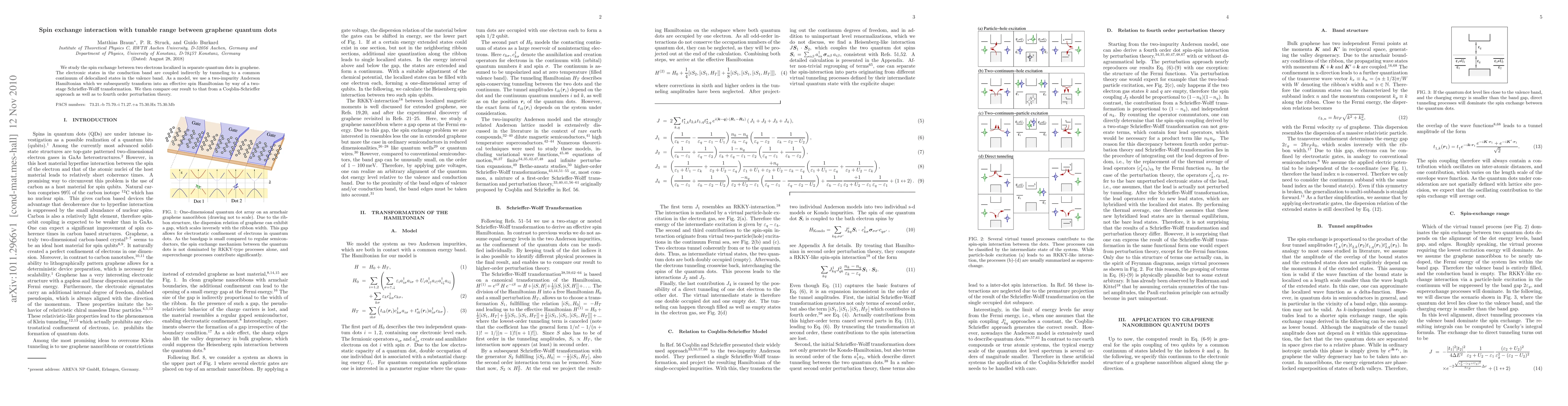 This paper investigates the spin exchange interaction between two electrons in separate graphene quantum dots, utilizing a two-impurity Anderson Hamiltonian transformed into an effective spin Hamiltonian via a Schrieffer-Wolff transformation. The study compares results with Coqblin-Schrieffer and fourth-order perturbation theory approaches.