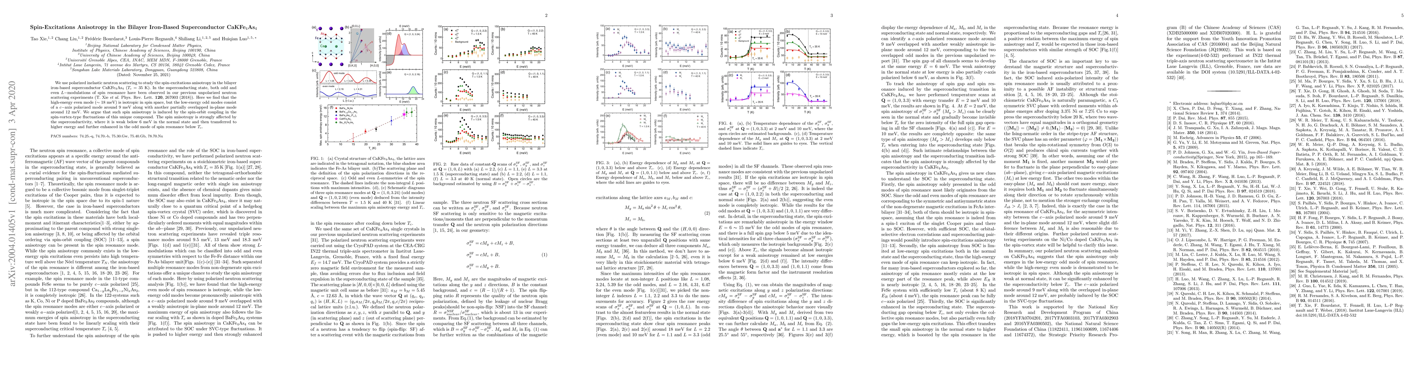 This study reveals spin-excitation anisotropy in the bilayer iron-based superconductor CaKFe$_4$As$_4$ using polarized neutron scattering, showing that high-energy spin modes are isotropic while low-energy modes exhibit $c$-axis polarization and in-plane fluctuations, suggesting spin-orbit coupling influences. The spin anisotropy is significantly enhanced in the superconducting state.
