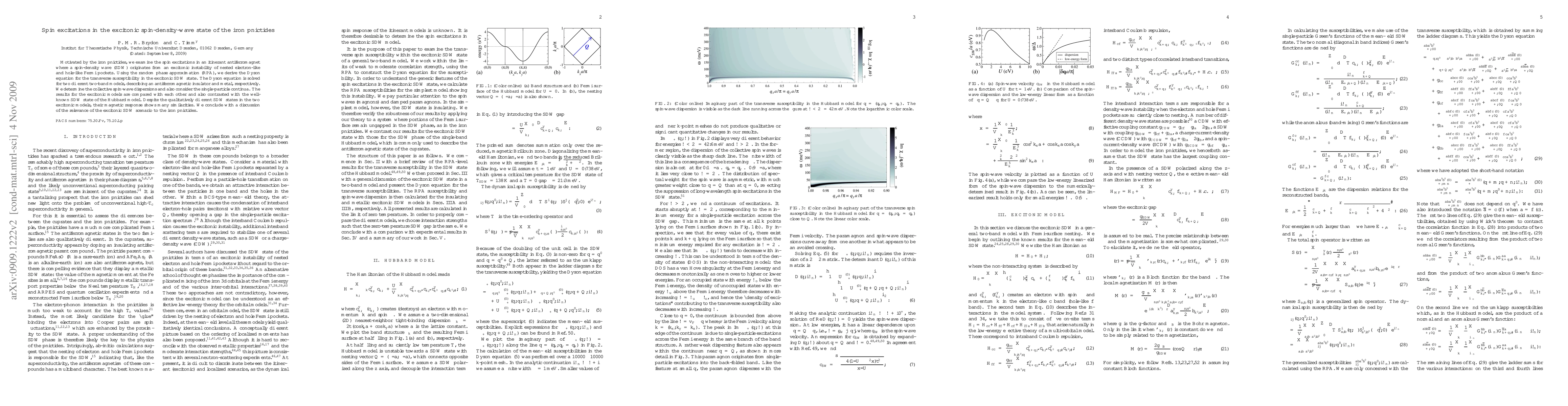 This paper investigates spin excitations in iron pnictides through an excitonic spin-density wave (SDW) state using the random phase approximation (RPA). It compares the magnetic response of two-band models for antiferromagnetic insulators and metals, finding similarities despite different SDW states, and discusses the implications for iron pnictides.