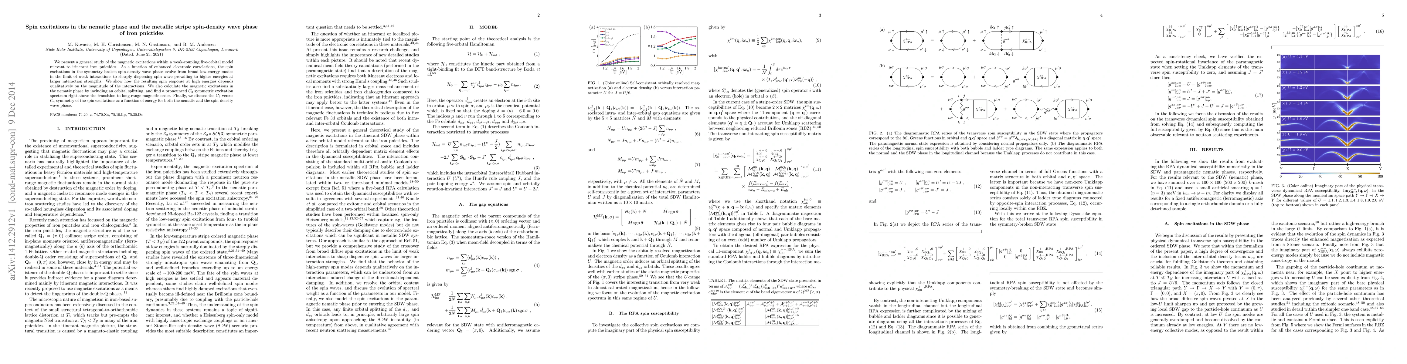 This paper investigates magnetic excitations in iron pnictides using a five-orbital model, showing how spin excitations transition from broad low-energy modes to sharply dispersing spin waves with increased electronic correlations. It also examines the nematic phase, revealing a C_2 symmetric excitation spectrum and discusses the symmetry of spin excitations in both nematic and spin-density wave phases.