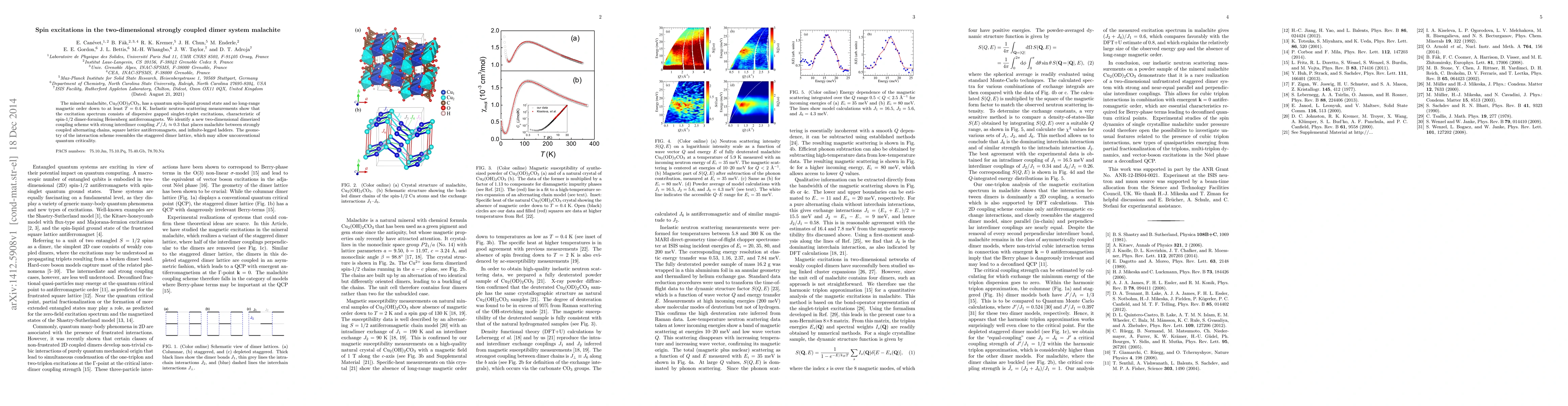 Malachite has a quantum spin-liquid ground state with no long-range magnetic order, characterized by dispersive gapped singlet-triplet excitations, and exhibits strong interdimer coupling.