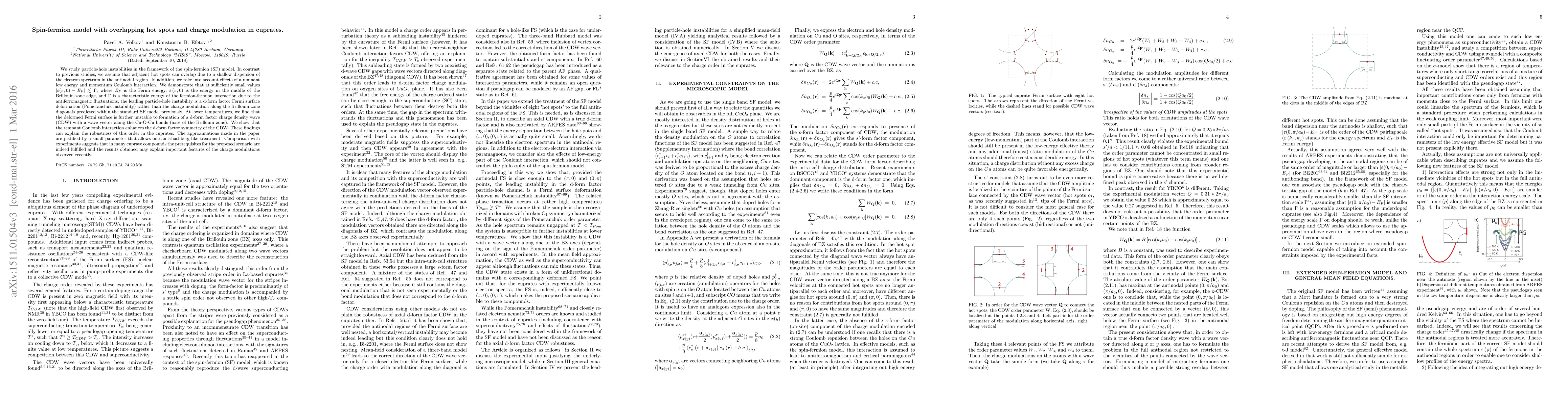 This paper investigates the spin-fermion model for cuprates, revealing that overlapping hot spots and a remnant Coulomb interaction lead to a Pomeranchuk instability instead of charge modulation. It further shows that the deformed Fermi surface can form a d-form factor charge density wave along the Cu-O-Cu bonds, explaining the robustness of this order in cuprates.