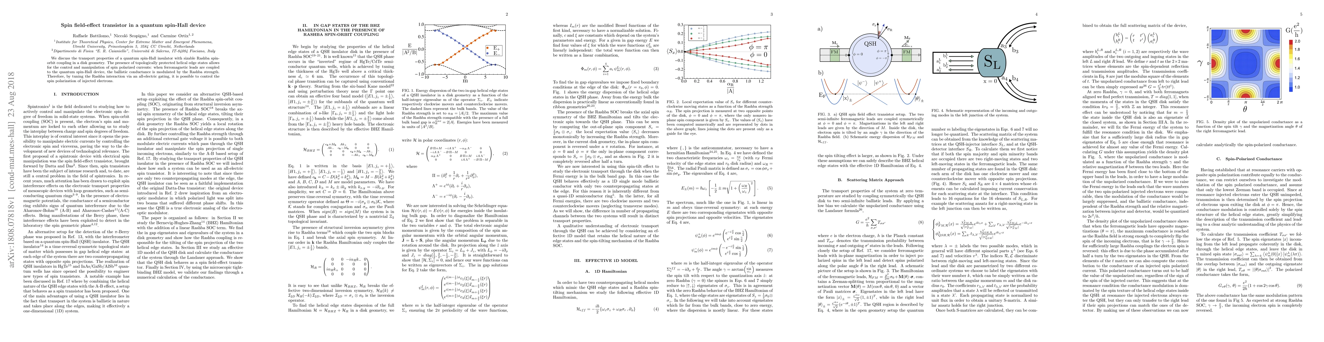 This paper explores the transport properties of a quantum spin-Hall insulator, demonstrating how topologically protected helical edge states enable the modulation of spin-polarized currents. By tuning the Rashba spin-orbit coupling with an electric gate, the spin polarization of injected electrons can be controlled.