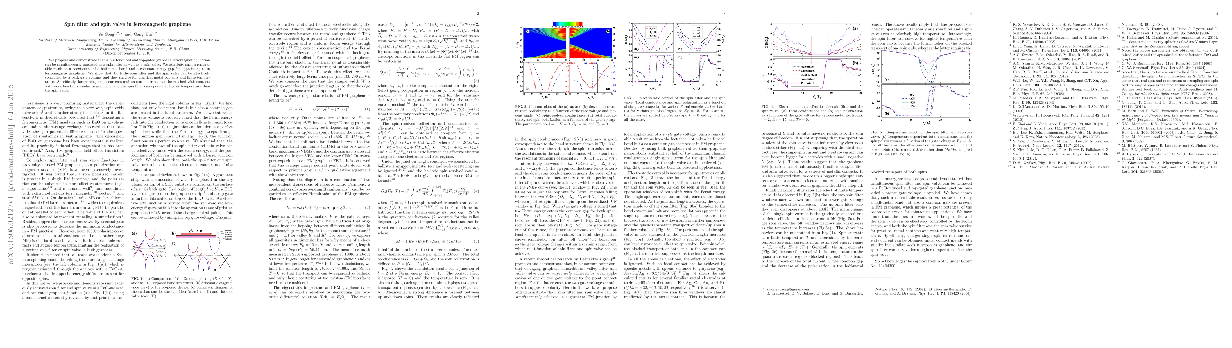 The paper demonstrates that a EuO-gated graphene junction functions as both a spin filter and a spin valve, attributed to its half-metal band and common energy gap for opposite spins. The performance of these functionalities is tunable via back gate voltage and remains stable under practical conditions.