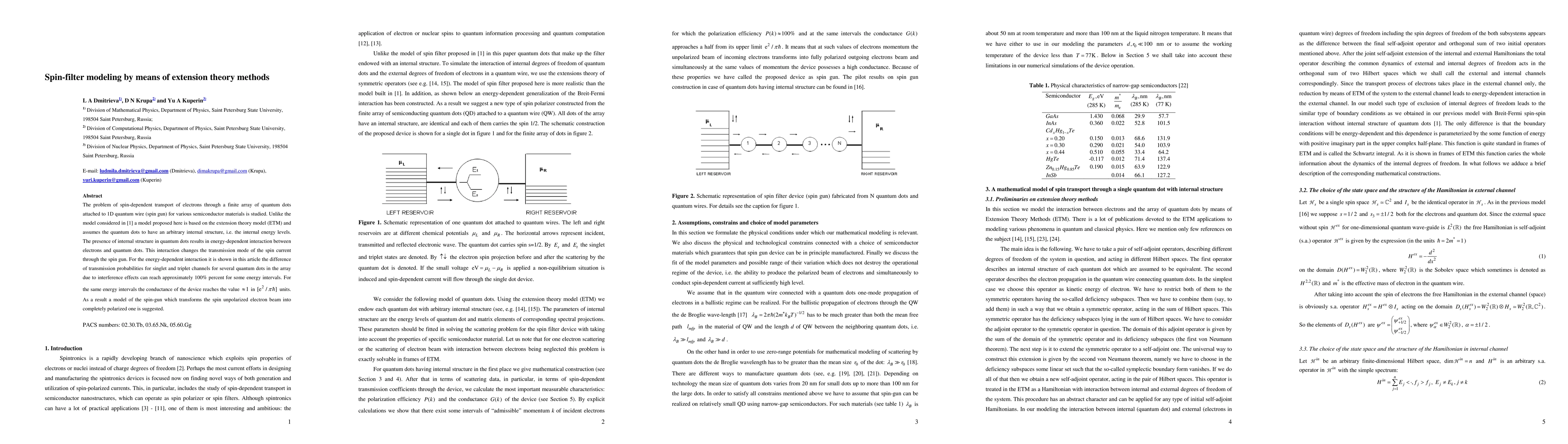 The problem of spin-dependent transport of electrons through a finite array of quantum dots attached to 1D quantum wire (spin gun) for various semiconductor materials is studied. Unlike the model considered in [1] a model proposed here is based on the extension theory model (ETM) and assumes the quantum dots to have an arbitrary internal structure, i.e. the internal energy levels. The presence of internal structure in quantum dots results in energy-dependent interaction between electrons and quantum dots. This interaction changes the transmission mode of the spin current through the spin gun. For the energy-dependent interaction it is shown in this article the difference of transmission probabilities for singlet and triplet channels for several quantum dots in the array due to interference effects can reach approximately 100% percent for some energy intervals. For the same energy intervals the conductance of the device reaches the value in units. As a result a model of the spin-gun which transforms the spin unpolarized electron beam into completely polarized one is suggested.