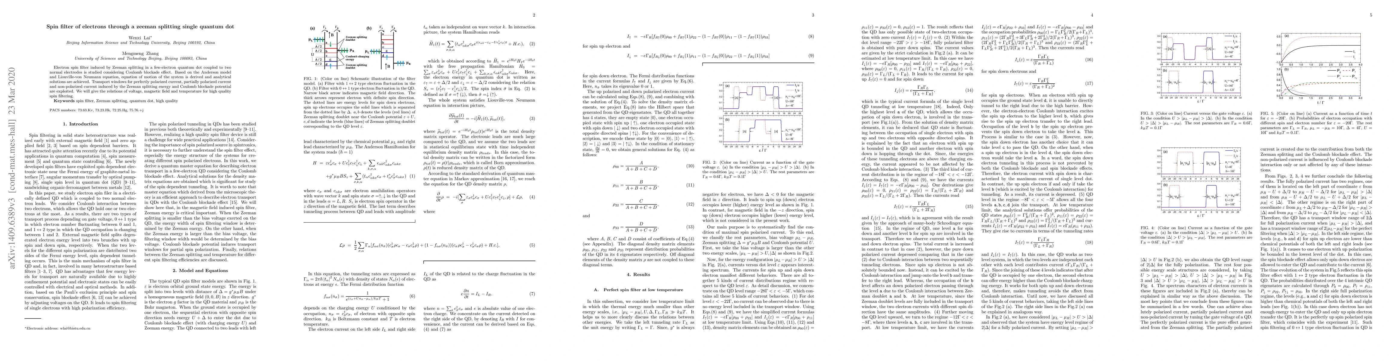 Electron spin filter induced by Zeeman splitting in a few-electron quantum dot coupled to two normal electrodes is studied considering Coulomb blockade effect. Based on the Anderson model and Liouville-von Neumann equation, equation of motion of the system is derived and analytical solutions are achieved. Transport windows for perfectly polarized current, partially polarized current and non-polarized current induced by the Zeeman splitting energy and Coulomb blockade potential are exploited. We will give the relations of voltage, magnetic field and temperature for high quality spin filtering.