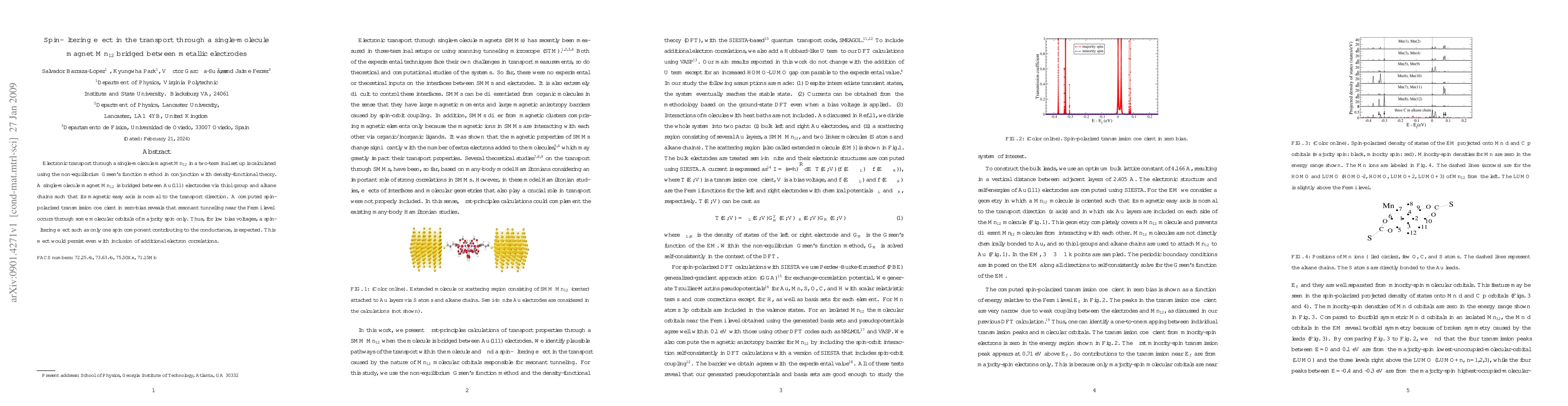 This study investigates the spin-filtering effect in electronic transport through a single-molecule magnet Mn$_{12}$ bridged between gold electrodes, revealing that only majority spin states contribute to conductance at low biases, as predicted by non-equilibrium Green's function calculations. The spin-filtering effect persists even with electron correlation effects included.