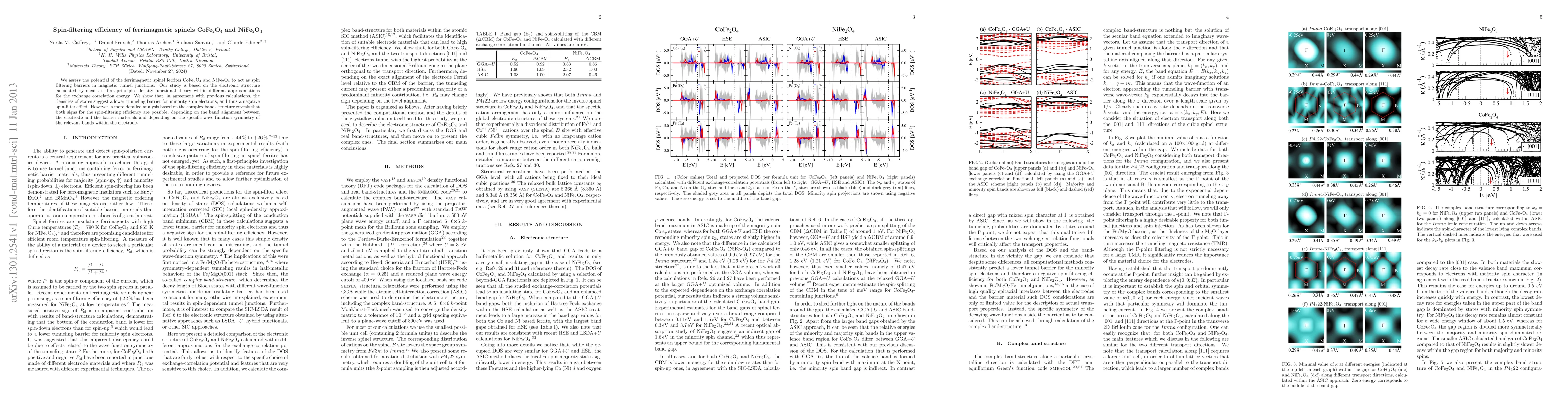 This paper evaluates the spin-filtering efficiency of ferrimagnetic spinel ferrites CoFe2O4 and NiFe2O4 for spintronic applications, finding a potential negative spin-filter effect due to lower tunneling barriers for minority spin electrons. However, detailed band-structure analysis indicates that the spin-filtering efficiency can vary based on band alignment and wave-function symmetry.