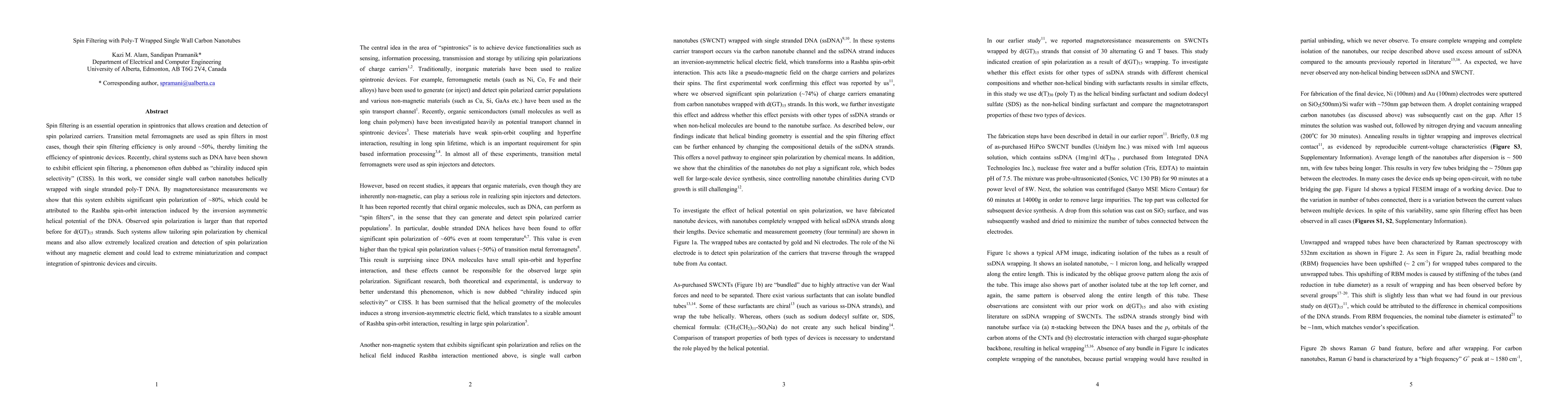 This research demonstrates that single wall carbon nanotubes wrapped with poly-T DNA exhibit significant spin polarization (~80%) due to the Rashba spin-orbit interaction, surpassing previous results with d(GT)15 strands. This chirality-induced spin selectivity could enable compact and efficient spintronic devices without traditional ferromagnetic materials.