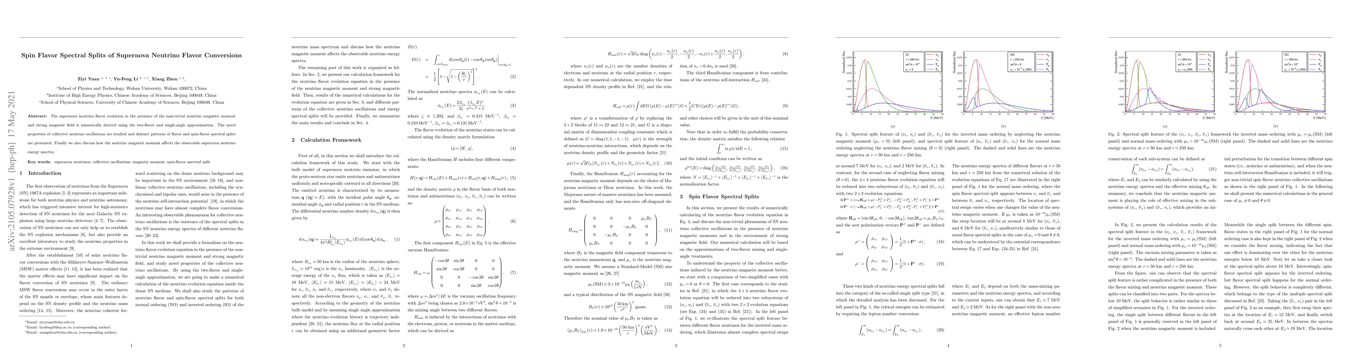 This paper investigates the effects of neutrino magnetic moments and strong magnetic fields on supernova neutrino flavor conversions, revealing distinct spin-flavor spectral splits and discussing their impact on observable neutrino energy spectra. The study employs numerical methods under two-flavor and single-angle approximations.