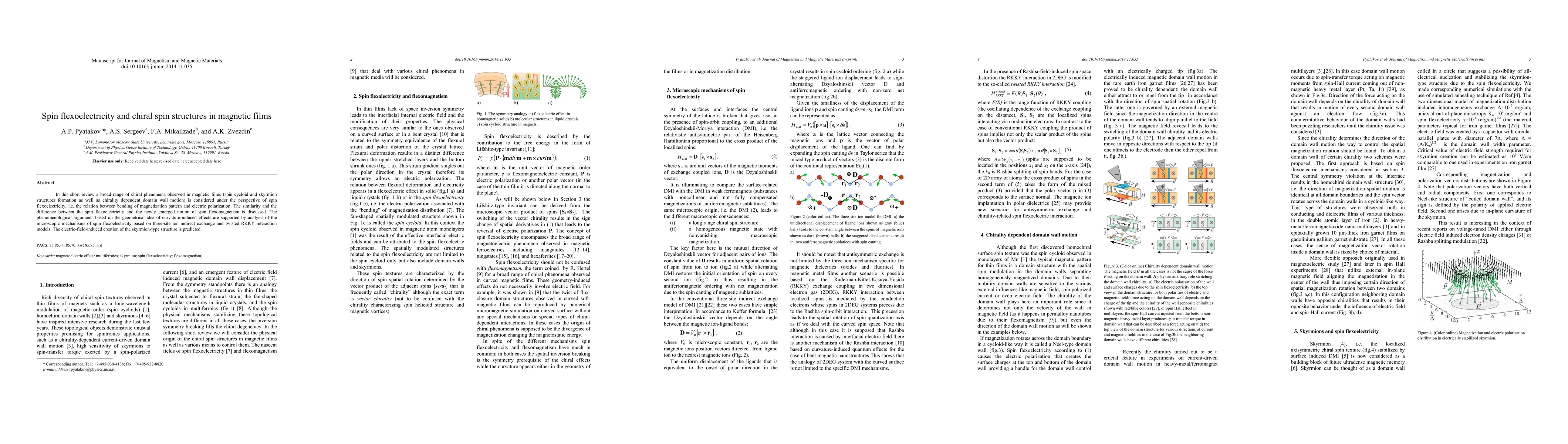 In this short review a broad range of chiral phenomena observed in magnetic films (spin cycloid and skyrmion structures formation as well as chirality dependent domain wall motion) is considered under the perspective of spin flexoelectricity, i.e. the relation between bending of magnetization pattern and electric polarization. The similarity and the difference between the spin flexoelectricity and the newly emerged notion of spin flexomagnetism is discussed. The phenomenological arguments based on the geometrical idea of curvature-induced effects are supported by analysis of the microscopic mechanisms of spin flexoelectricity based on three-site ion indirect exchange and twisted RKKY interaction models. The electric-field-induced creation of the single skyrmion is predicted.