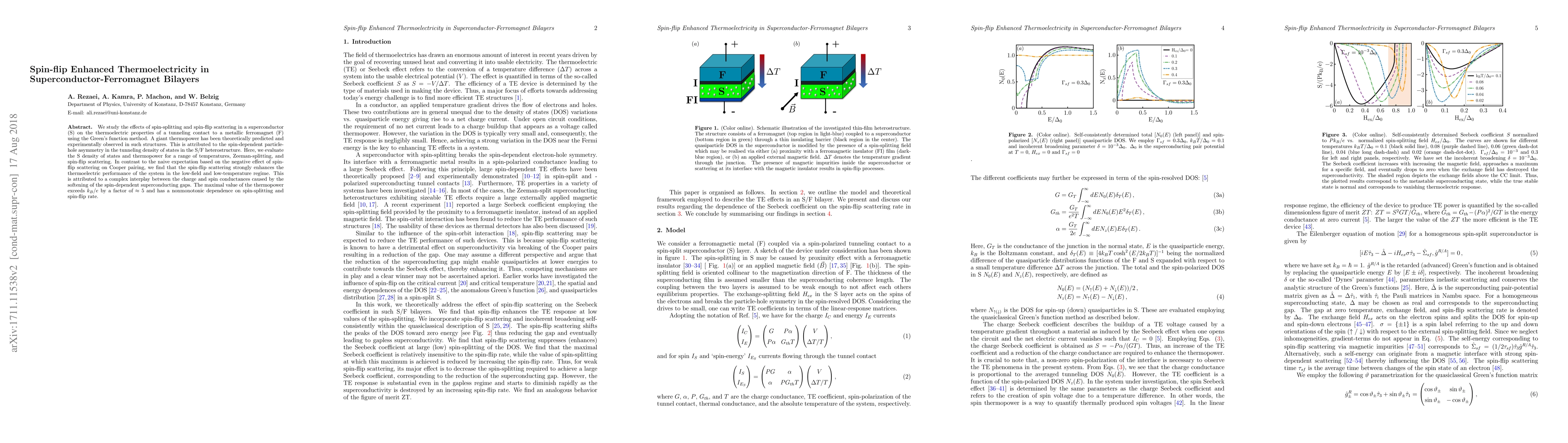 This paper investigates the enhanced thermoelectric properties in superconductor-ferromagnet bilayers, finding that spin-flip scattering, contrary to expectations, significantly boosts thermopower due to the interplay between charge and spin conductances, leading to a maximal thermopower value exceeding $k_{B}/e$ by a factor of approximately 5.