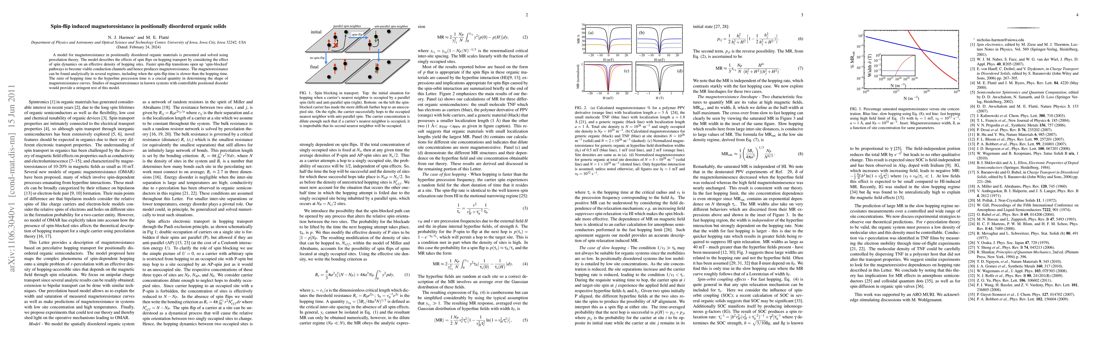 This paper presents a model explaining magnetoresistance in positionally disordered organic solids, demonstrating that faster spin-flip transitions enable previously inaccessible conduction pathways, leading to measurable magnetoresistance. The model's analytical predictions are validated by the ratio of hopping time to hyperfine precession time, suggesting that experiments in controllable disordered systems could verify these findings.