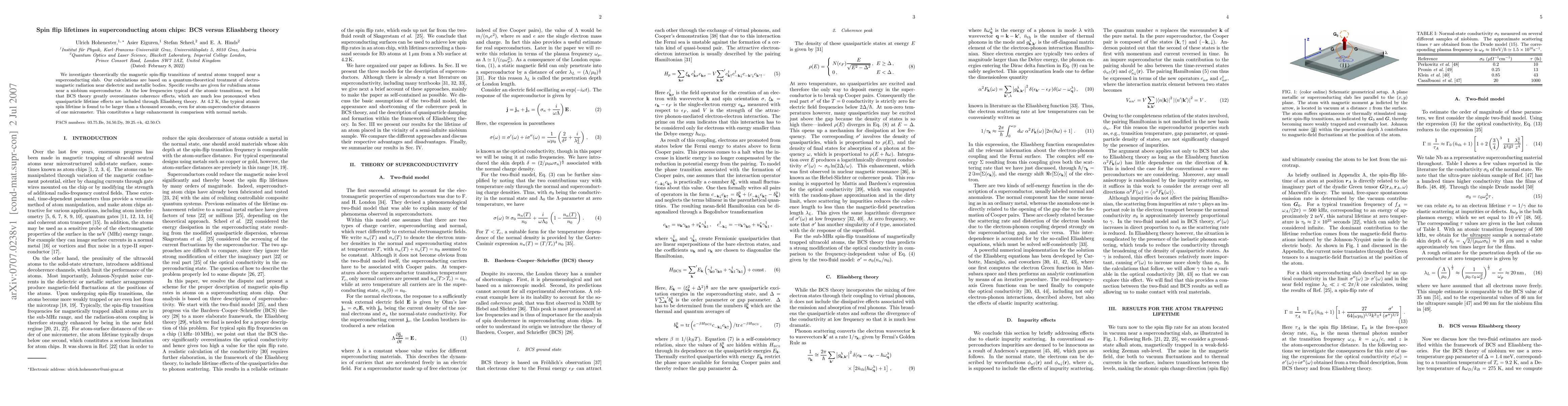 This paper theoretically examines spin-flip transitions in neutral rubidium atoms near a niobium superconductor, finding that BCS theory overestimates coherence effects. Eliashberg theory reveals significantly longer spin lifetimes, exceeding a thousand seconds at 4.2 K, even at micrometer distances, showing a substantial improvement over normal metals.
