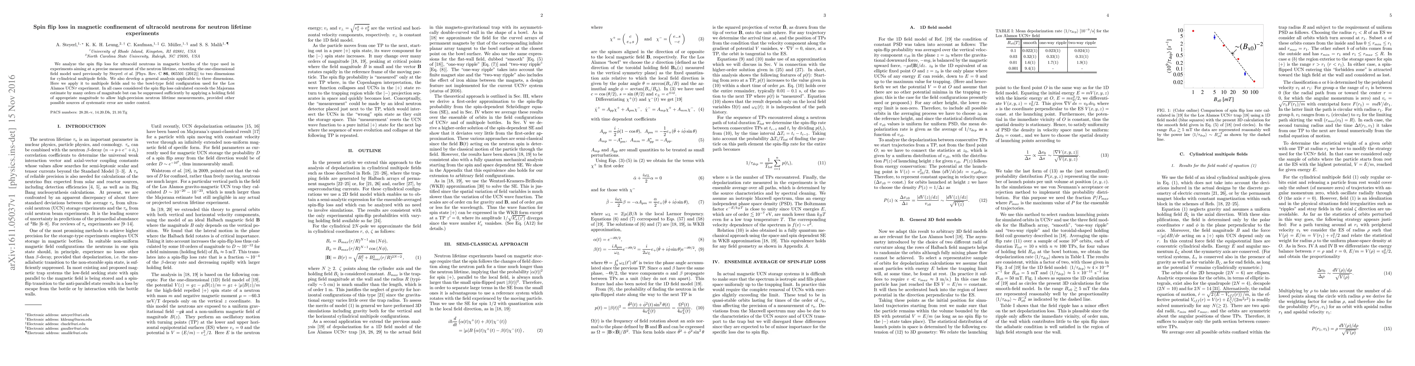 This paper analyzes spin flip loss in magnetic confinement for ultracold neutrons in magnetic bottles, extending the model to two and three dimensions for cylindrical multipole fields. It finds that spin flip loss can be significantly reduced by applying an appropriate holding field, enabling high-precision neutron lifetime measurements if other systematic errors are controlled.