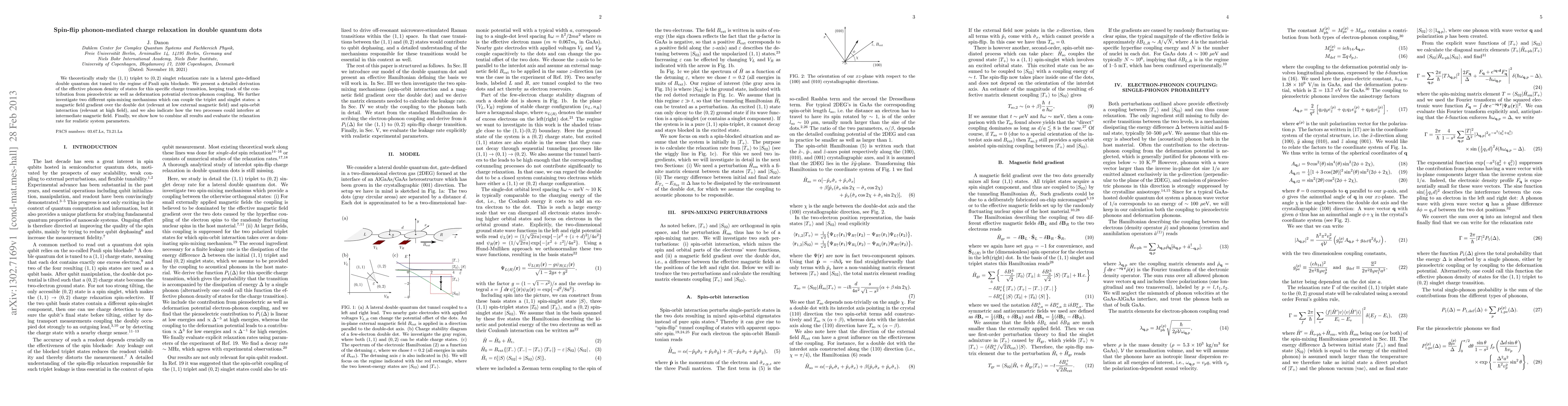 This paper theoretically investigates the spin-flip phonon-mediated charge relaxation in a double quantum dot, focusing on the $(1,1)$ triplet to $(0,2)$ singlet transition under Pauli spin blockade. It derives the effective phonon density of states considering both piezoelectric and deformation potential electron-phonon interactions, and analyzes spin-mixing mechanisms influenced by magnetic field gradients and spin-orbit interactions.