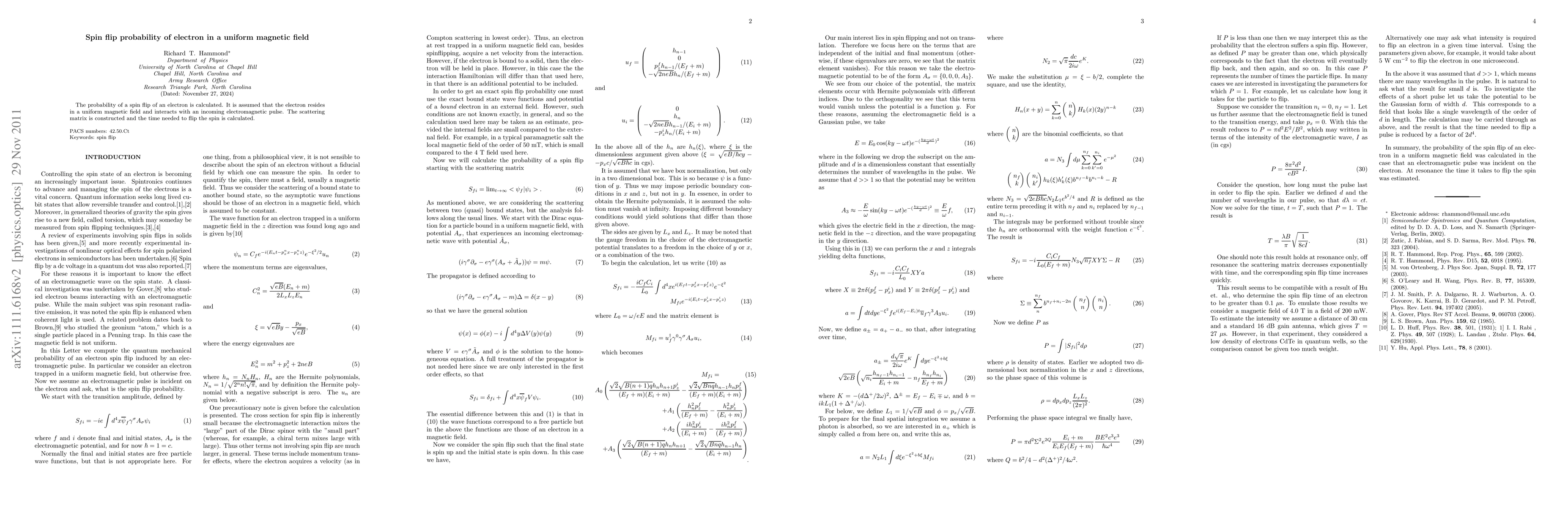 This paper calculates the probability of an electron spin flip in a uniform magnetic field when it interacts with an incoming electromagnetic pulse. The study constructs a scattering matrix and determines the time required for the spin flip.
