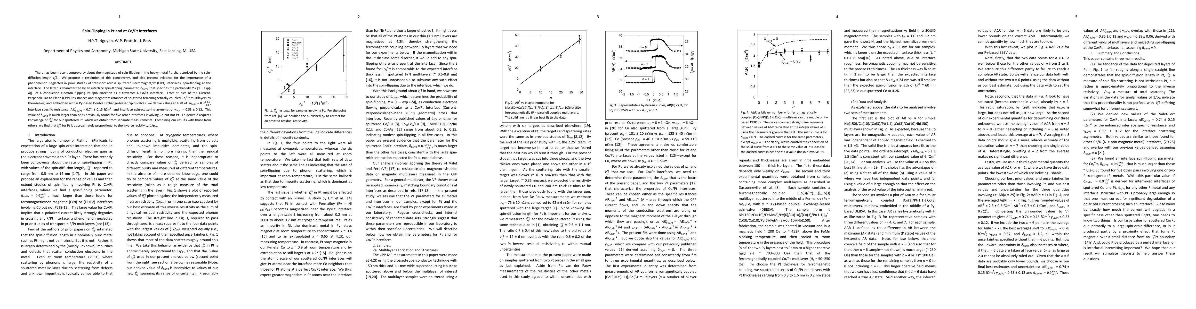 This paper resolves the controversy over spin-flipping in Pt by determining its spin-diffusion length, lsf(Pt), and highlights significant spin-flipping at Co/Pt interfaces characterized by a large interface spin-flipping parameter, delta(Co/Pt) = 0.9 (+0.5/-0.2). The study finds that lsf(Pt) is proportional to the inverse resistivity, 1/rho(Pt).