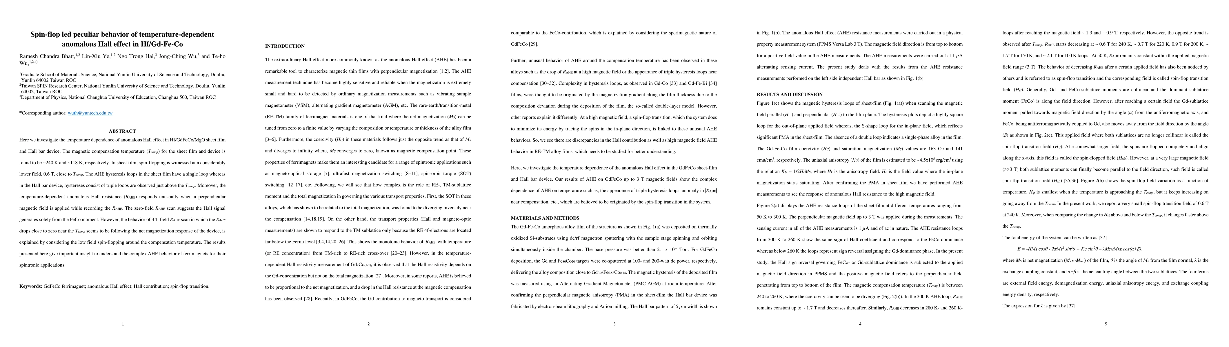 Researchers investigate the temperature-dependent anomalous Hall effect in a ferrimagnet alloy, discovering spin-flopping behavior at low fields near compensation temperatures.